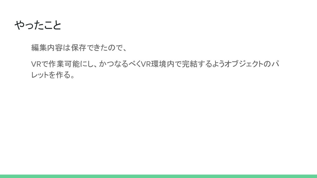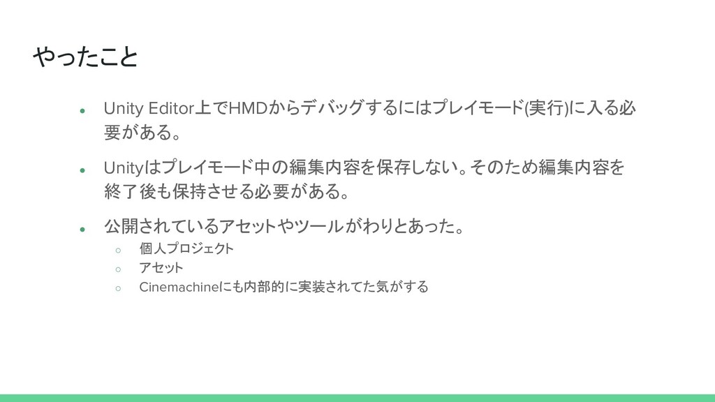 やったこと • Unity Editor上でHMDからデバッグするにはプレイモード(実行)に入る必 要がある。 • Unityはプレイモード中の編集内容を保存しない。そのため編集内容を 終了後も保持させる必要がある。 • 公開されているアセットやツールがわりとあった。