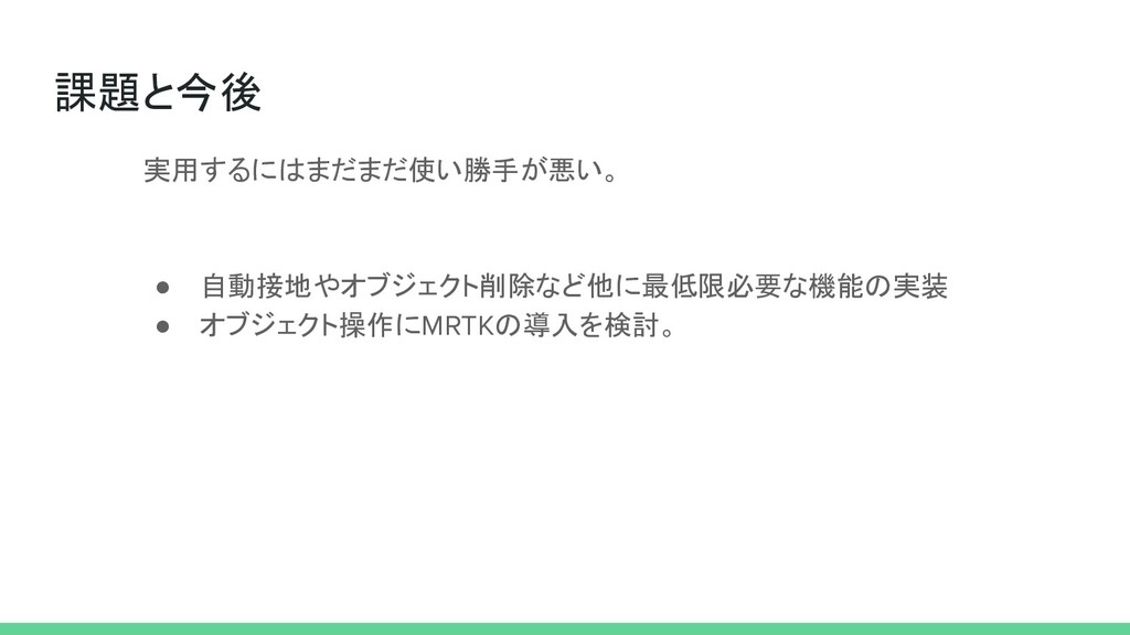 課題と今後 実用するにはまだまだ使い勝手が悪い。 • 自動接地やオブジェクト削除など他に最低限必要な機能の実装 • オブジェクト操作にMRTKの導入を検討。