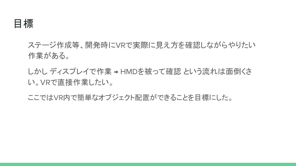 目標 ステージ作成等、開発時にVRで実際に見え方を確認しながらやりたい 作業がある。 しかし ディスプレイで作業 → HMDを被って確認 という流れは面倒くさ い。VRで直接作業したい。 ここではVR内で簡単なオブジェクト配置ができることを目標にした。
