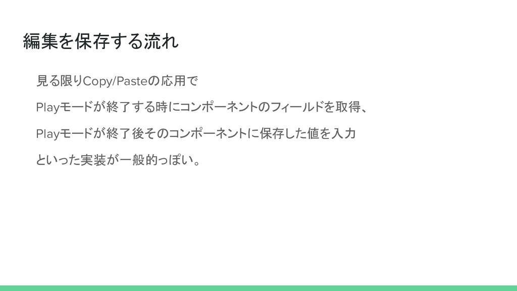 編集を保存する流れ 見る限りCopy/Pasteの応用で Playモードが終了する時にコンポーネントのフィールドを取得、 Playモードが終了後そのコンポーネントに保存した値を入力 といった実装が一般的っぽい。