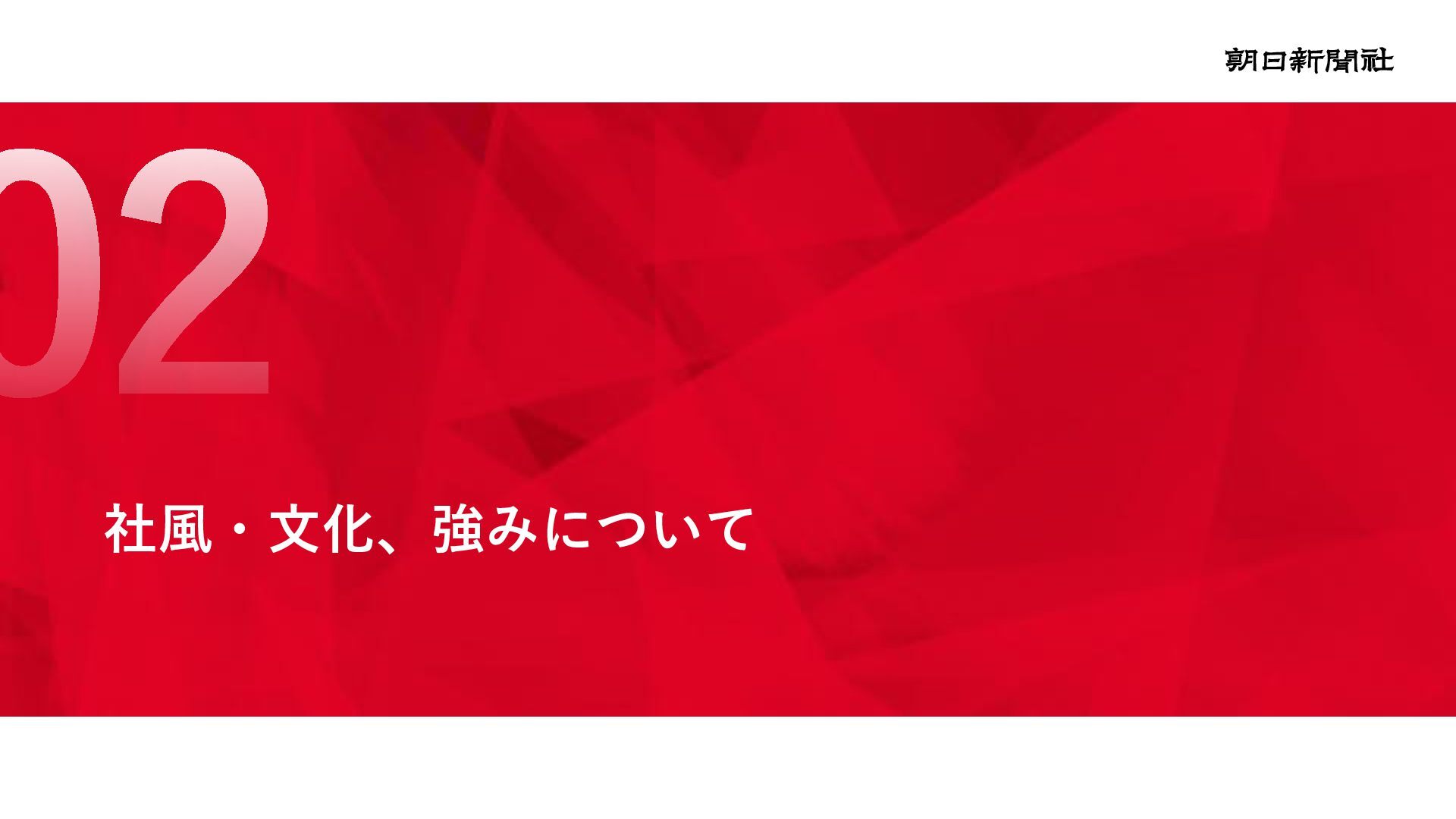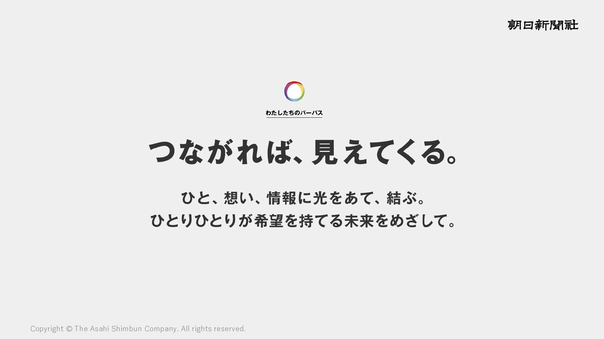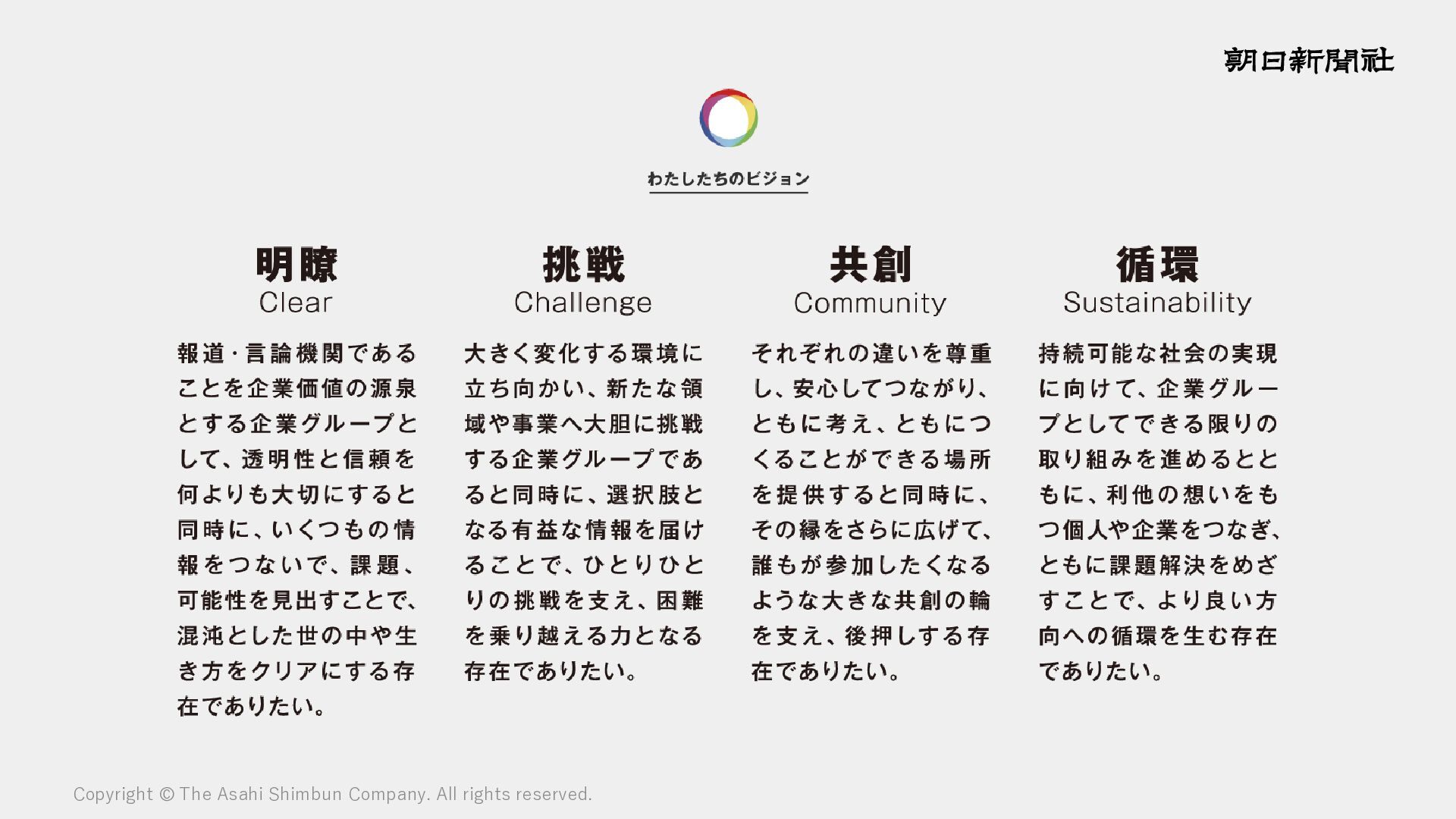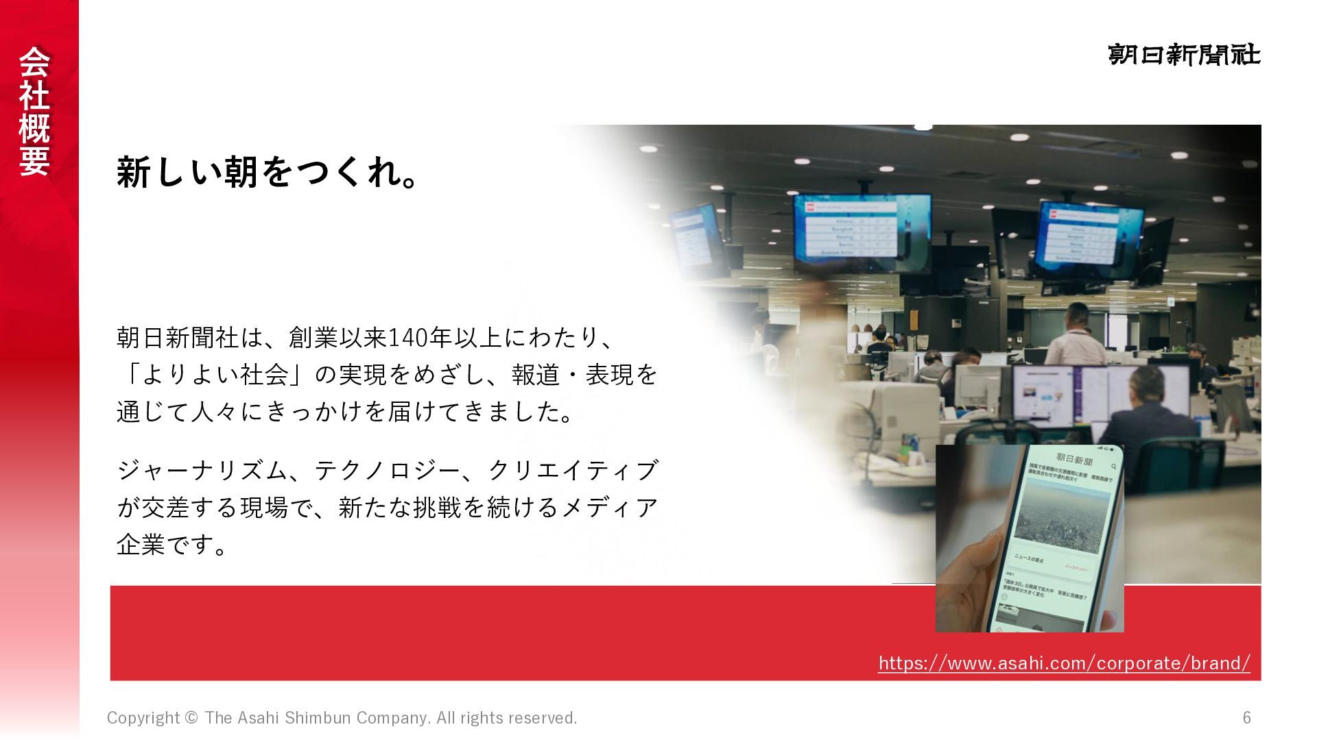 Company. All rights reserved. 新しい朝をつくれ。 朝日新聞社は、創業以来140年以上にわたり、 「よりよい社会」の実現をめざし、報道・表現を 通じて人々にきっかけを届けてきました。 ジャーナリズム、テクノロジー、クリエイティブ が交差する現場で、新たな挑戦を続けるメディア 企業です。 https://www.asahi.com/corporate/brand/