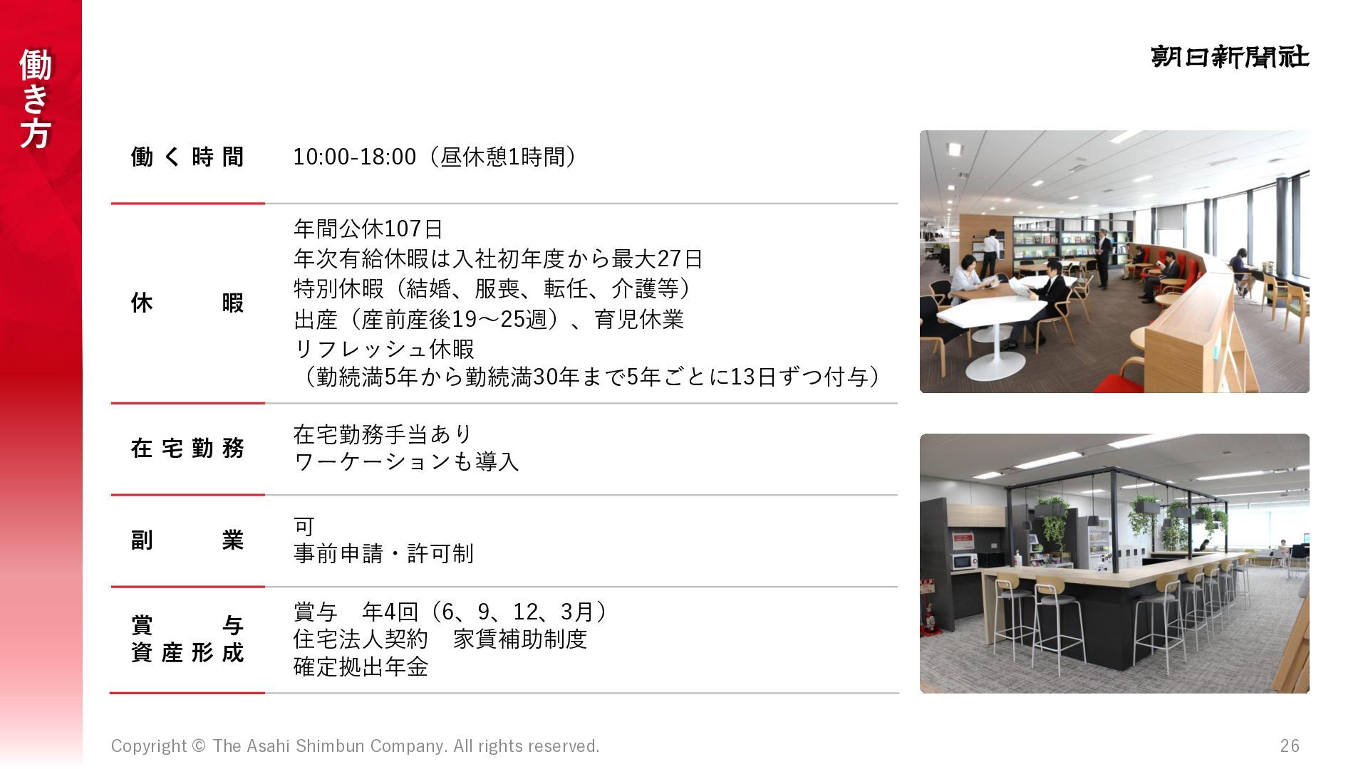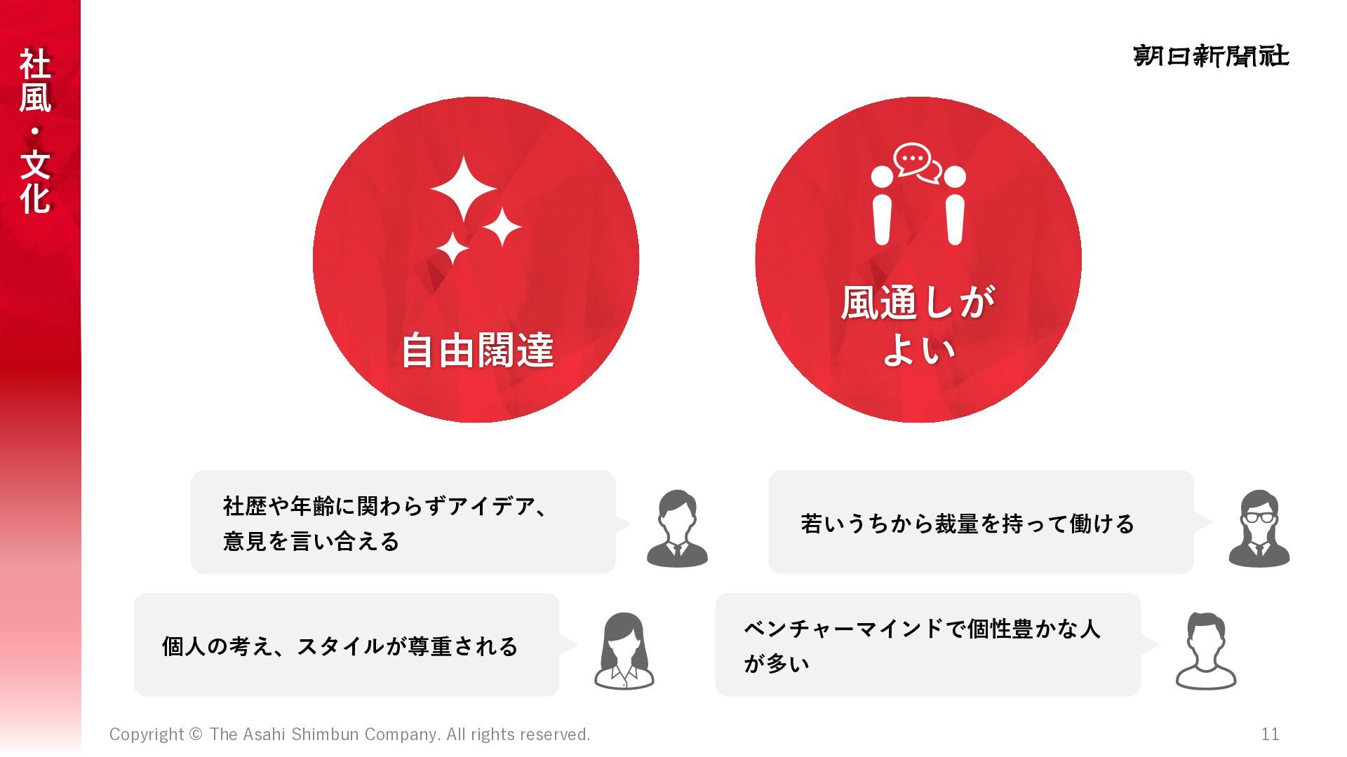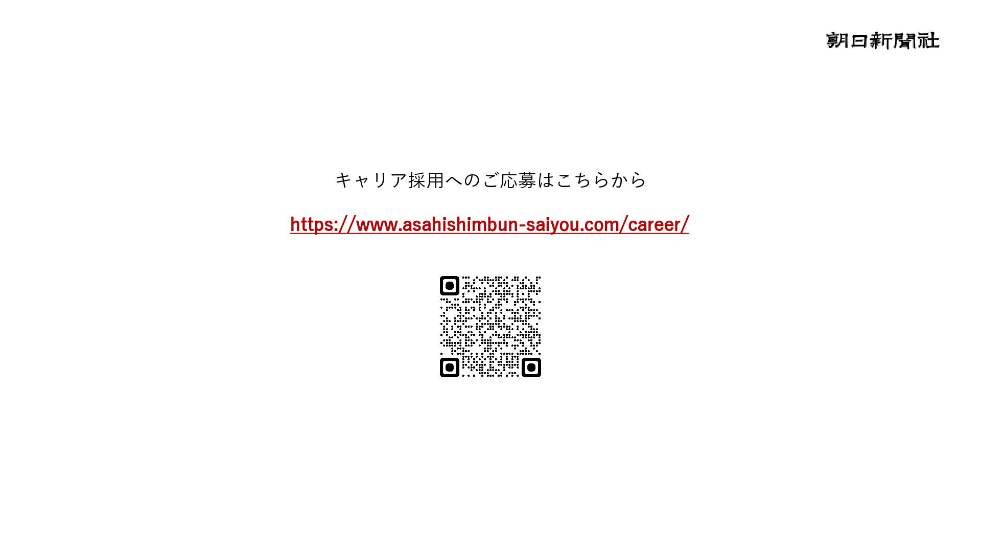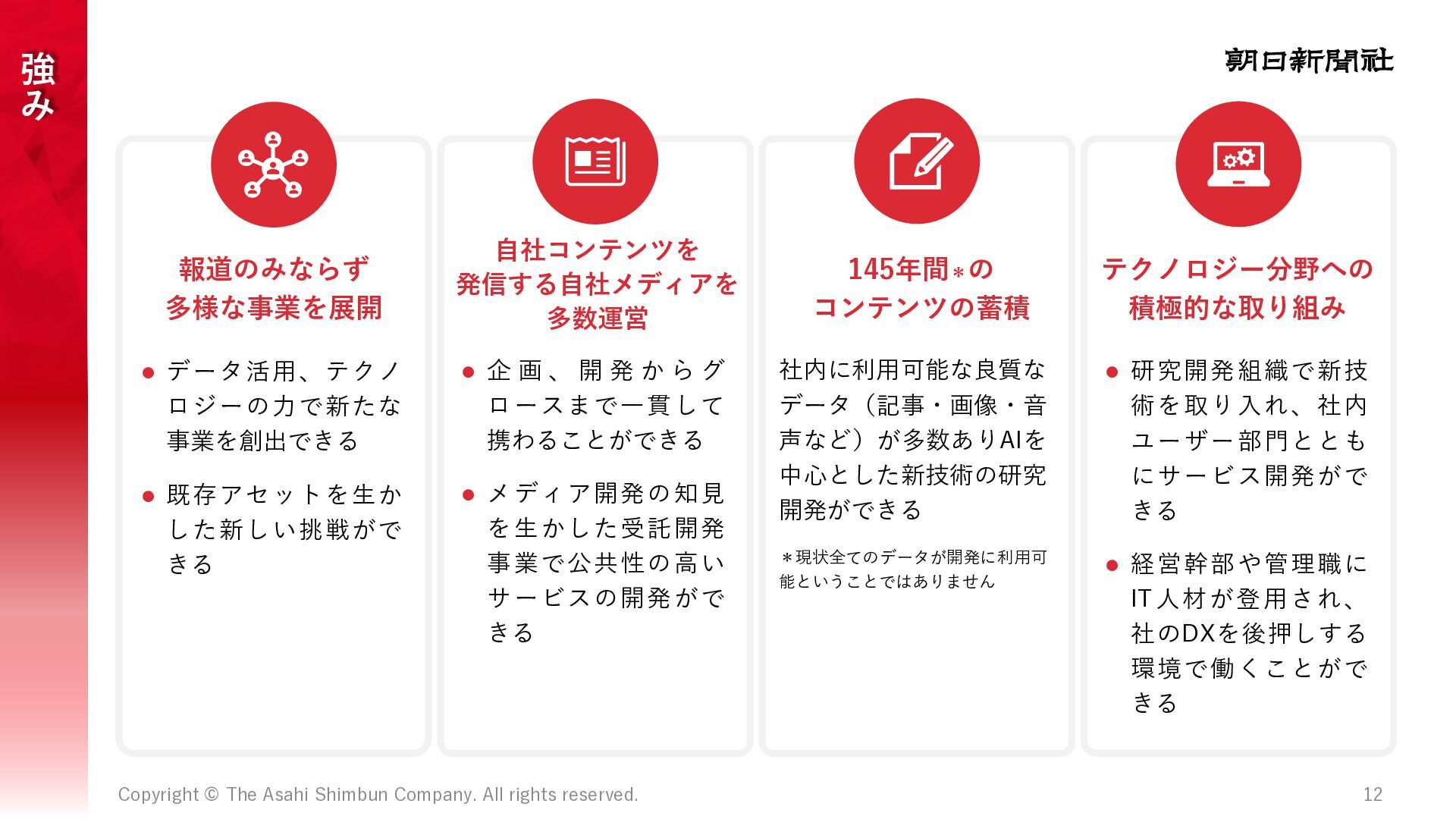 Company. All rights reserved. 新しい朝をつくれ。 朝日新聞社は、創業以来140年以上にわたり、 「よりよい社会」の実現をめざし、報道・表現を 通じて人々にきっかけを届けてきました。 ジャーナリズム、テクノロジー、クリエイティブ が交差する現場で、新たな挑戦を続けるメディア 企業です。 https://www.asahi.com/corporate/brand/