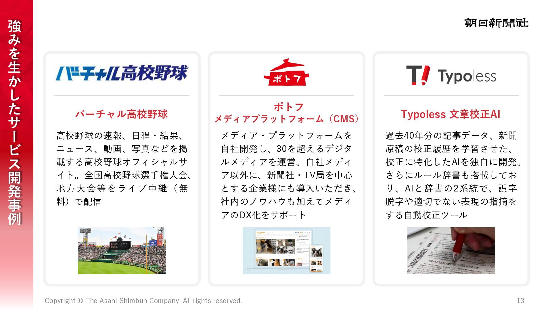 強 み を 生 か し た サ ー ビ ス 開 発 事 例 高校野球の速報、日程・結果、 ニュース、動画、写真などを掲 載する高校野球オフィシャルサ イト。全国高校野球選手権大会、 地方大会等をライブ中継(無 料)で配信 メディア・プラットフォームを 自社開発し、30を超えるデジタ ルメディアを運営。自社メディ ア以外に、新聞社・TV局を中心 とする企業様にも導入いただき、 社内のノウハウも加えてメディ アのDX化をサポート 過去40年分の記事データ、新聞 原稿の校正履歴を学習させた、 校正に特化したAIを独自に開発。 さらにルール辞書も搭載してお り、AIと辞書の2系統で、誤字 脱字や適切でない表現の指摘を する自動校正ツール バーチャル高校野球 ポトフ メディアプラットフォーム(CMS) Typoless 文章校正AI