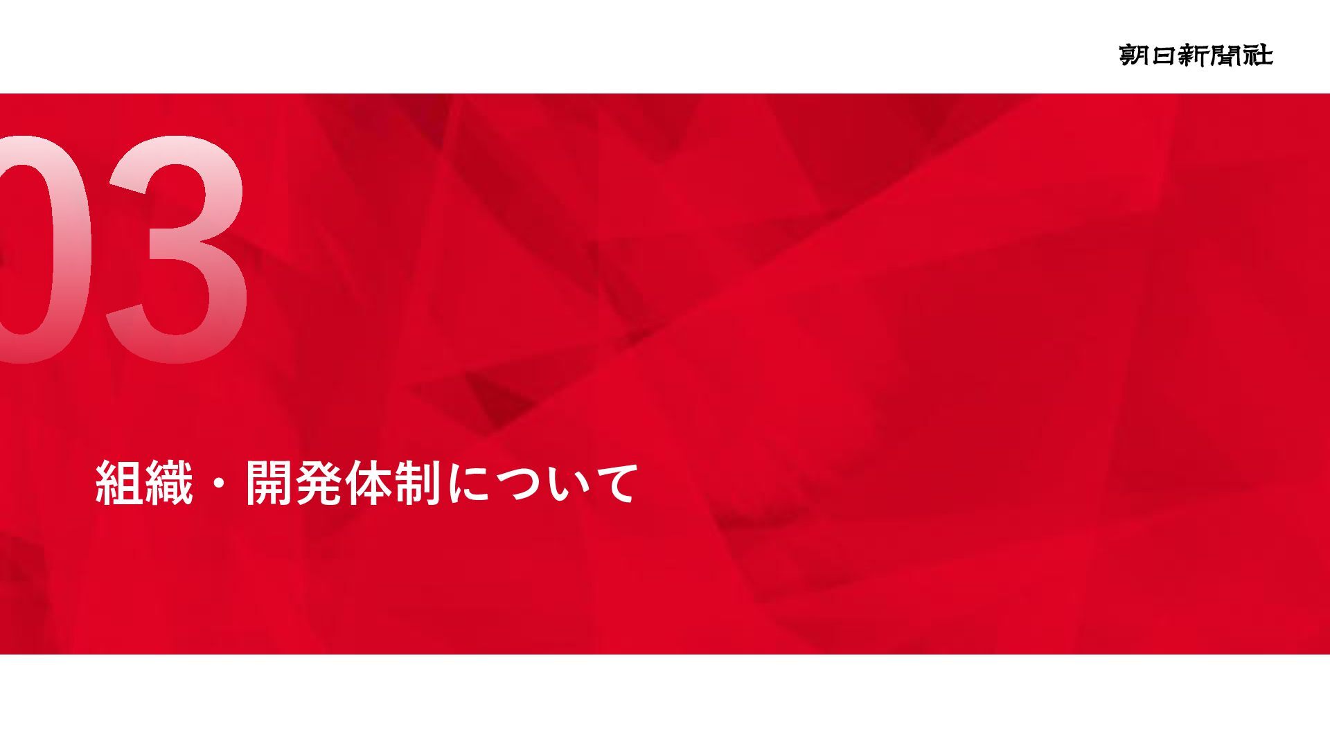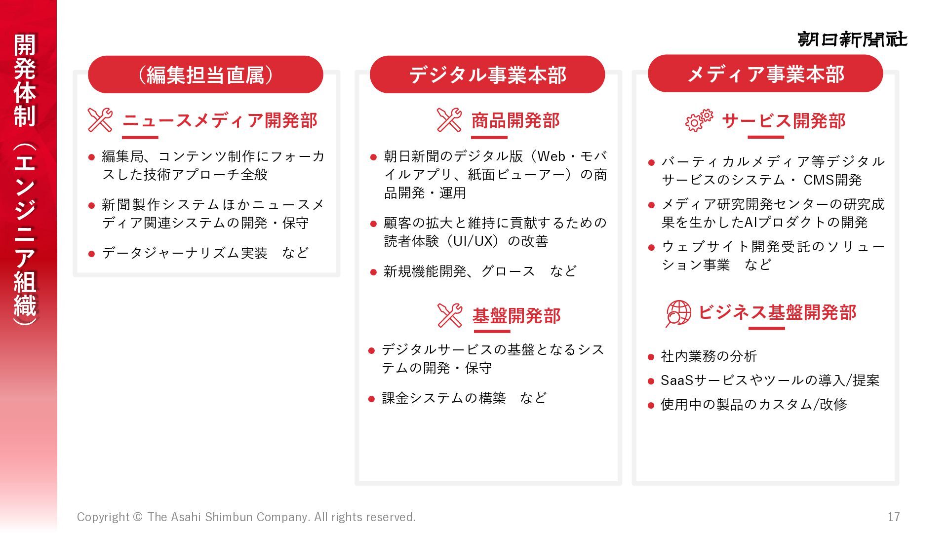 開 発 体 制 ( エ ン ジ ニ ア 組 織 ) デジタル事業本部 メディア事業本部 ⚫ バーティカルメディア等デジタル サービスのシステム・ CMS開発 ⚫ メディア研究開発センターの研究成 果を生かしたAIプロダクトの開発 ⚫ ウェブサイト開発受託のソリュー ション事業 など ⚫ 朝日新聞のデジタル版(Web・モバ イルアプリ、紙面ビューアー)の商 品開発・運用 ⚫ 顧客の拡大と維持に貢献するための 読者体験(UI/UX)の改善 ⚫ 新規機能開発、グロース など 商品開発部 サービス開発部 ⚫ 社内業務の分析 ⚫ SaaSサービスやツールの導入/提案 ⚫ 使用中の製品のカスタム/改修 ビジネス基盤開発部 (編集担当直属) ⚫ 編集局、コンテンツ制作にフォーカ スした技術アプローチ全般 ⚫ 新聞製作システムほかニュースメ ディア関連システムの開発・保守 ⚫ データジャーナリズム実装 など ニュースメディア開発部 基盤開発部 ⚫ デジタルサービスの基盤となるシス テムの開発・保守 ⚫ 課金システムの構築 など