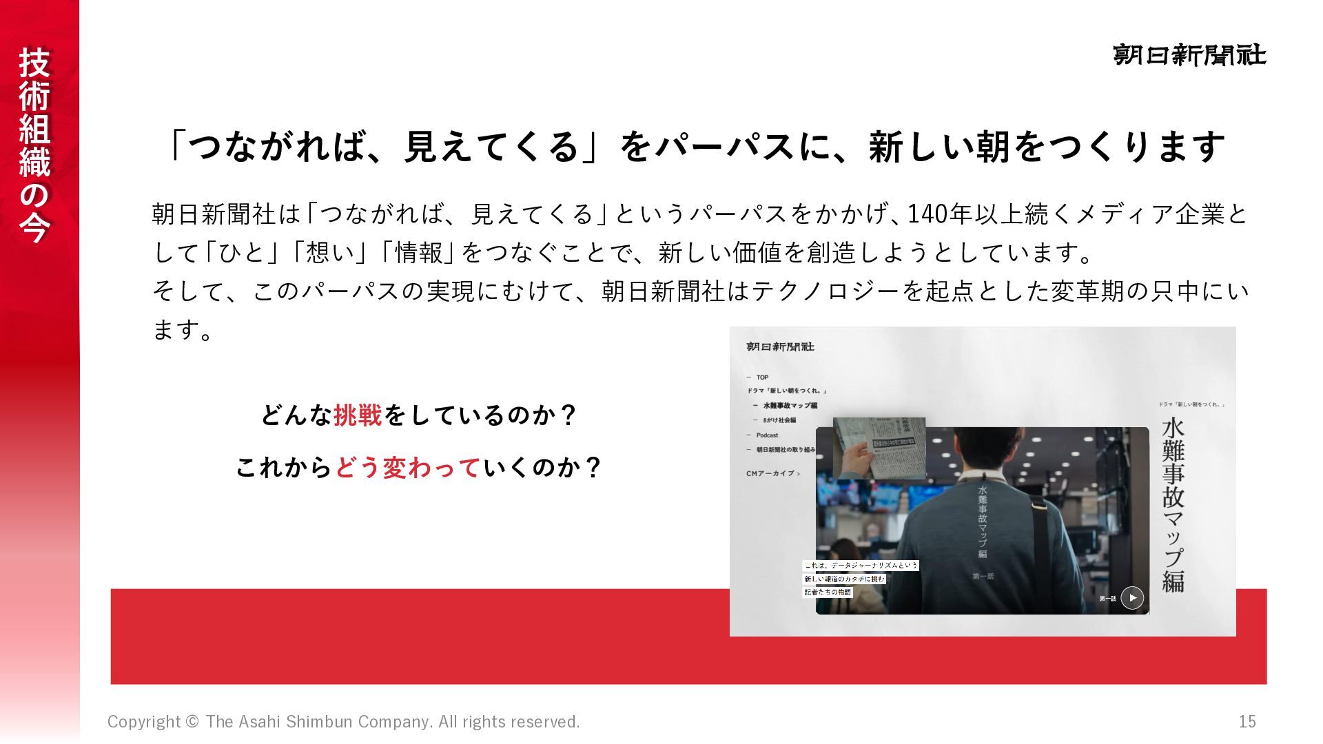 技 術 組 織 の 今 「つながれば、見えてくる」をパーパスに、新しい朝をつくります 朝日新聞社は 「つながれば、見えてくる」 というパーパスをかかげ、 140年以上続くメディア企業と して 「ひと」 「想い」 「情報」 をつなぐことで、新しい価値を創造しようとしています。 そして、このパーパスの実現にむけて、朝日新聞社はテクノロジーを起点とした変革期の只中にい ます。 どんな挑戦をしているのか? これからどう変わっていくのか? 第一話