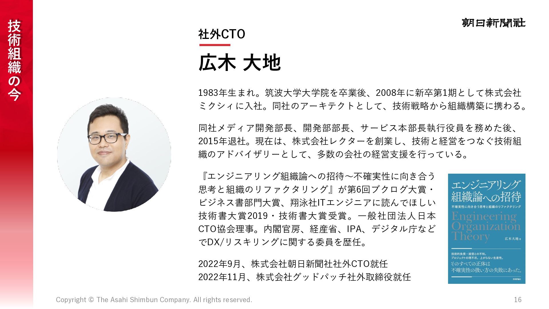 技 術 組 織 の 今 広木 大地 1983年生まれ。筑波大学大学院を卒業後、2008年に新卒第1期として株式会社 ミクシィに入社。同社のアーキテクトとして、技術戦略から組織構築に携わる。 同社メディア開発部長、開発部部長、サービス本部長執行役員を務めた後、 2015年退社。現在は、株式会社レクターを創業し、技術と経営をつなぐ技術組 織のアドバイザリーとして、多数の会社の経営支援を行っている。 社外CTO 『エンジニアリング組織論への招待~不確実性に向き合う 思考と組織のリファクタリング』が第6回ブクログ大賞・ ビジネス書部門大賞、翔泳社ITエンジニアに読んでほしい 技術書大賞2019・技術書大賞受賞。一般社団法人日本 CTO協会理事。内閣官房、経産省、IPA、デジタル庁など でDX/リスキリングに関する委員を歴任。 2022年9月、株式会社朝日新聞社社外CTO就任 2022年11月、株式会社グッドパッチ社外取締役就任