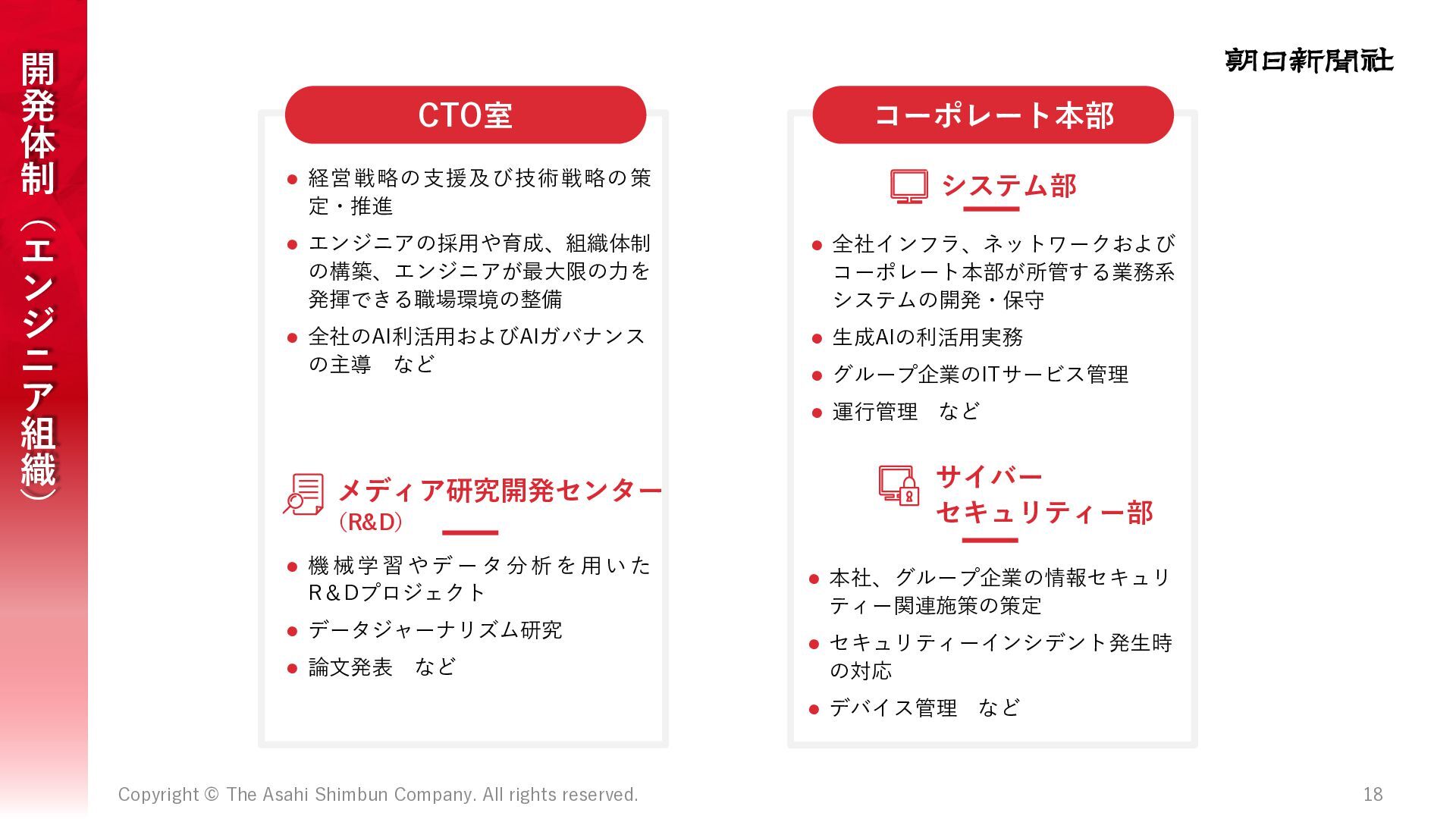 rights reserved. 開 発 体 制 ( エ ン ジ ニ ア 組 織 ) コーポレート本部 ⚫ 全社インフラ、ネットワークおよび コーポレート本部が所管する業務系 システムの開発・保守 ⚫ 生成AIの利活用実務 ⚫ グループ企業のITサービス管理 ⚫ 運行管理 など ⚫ 本社、グループ企業の情報セキュリ ティー関連施策の策定 ⚫ セキュリティーインシデント発生時 の対応 ⚫ デバイス管理 など サイバー セキュリティー部 システム部 ⚫ 機 械 学 習 や デ ー タ 分 析 を 用 い た R&Dプロジェクト ⚫ データジャーナリズム研究 ⚫ 論文発表 など CTO室 ⚫ 経営戦略の支援及び技術戦略の策 定・推進 ⚫ エンジニアの採用や育成、組織体制 の構築、エンジニアが最大限の力を 発揮できる職場環境の整備 ⚫ 全社のAI利活用およびAIガバナンス の主導 など