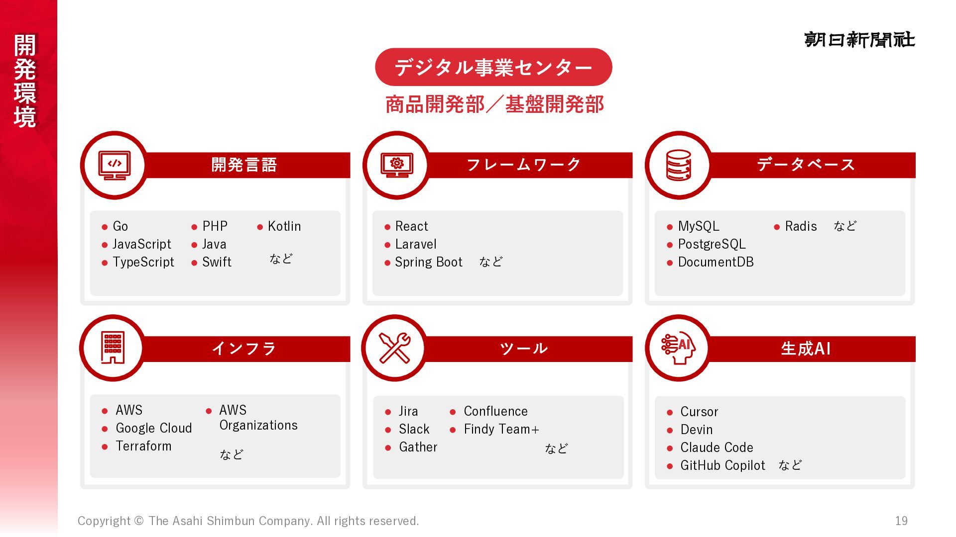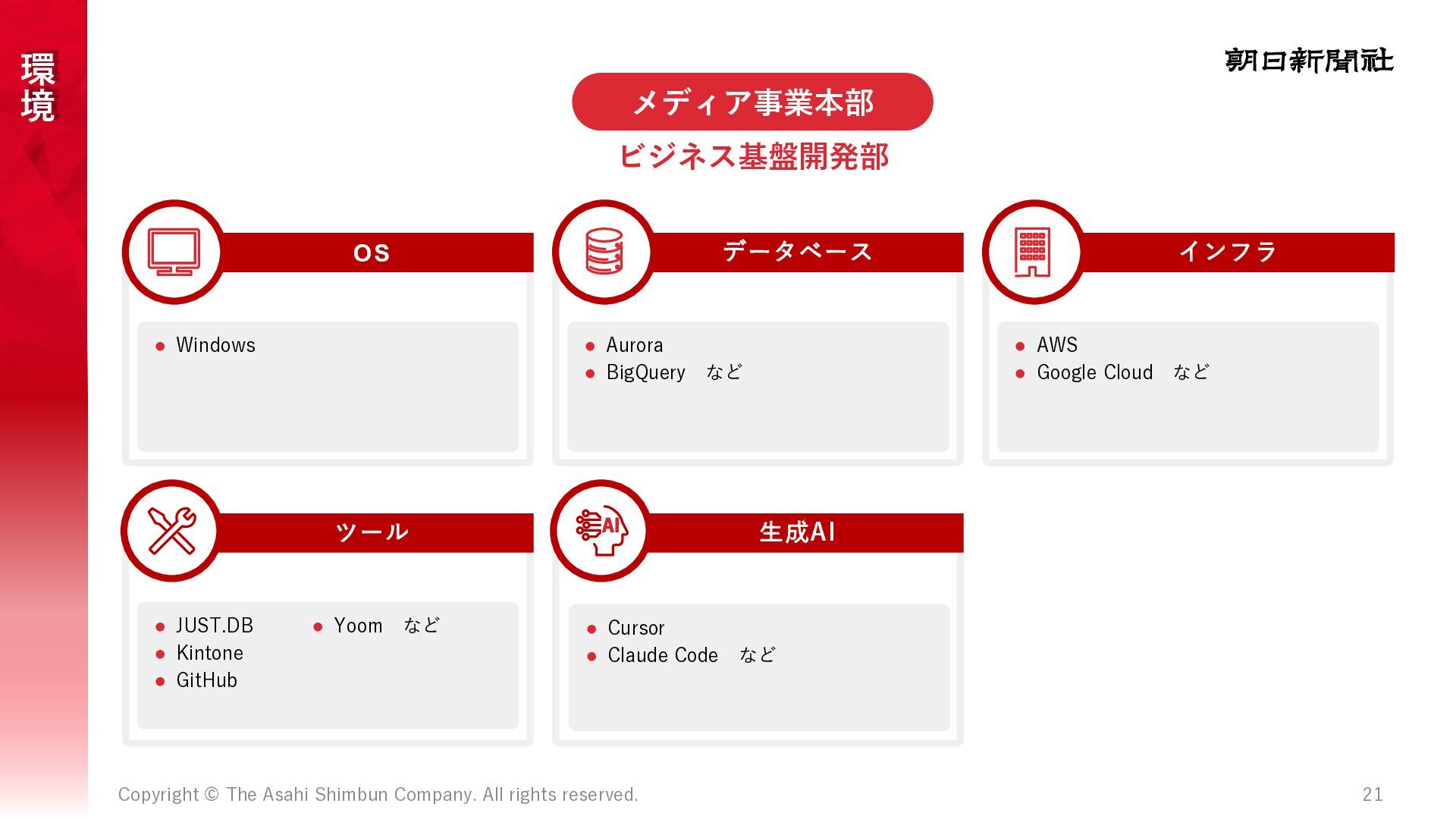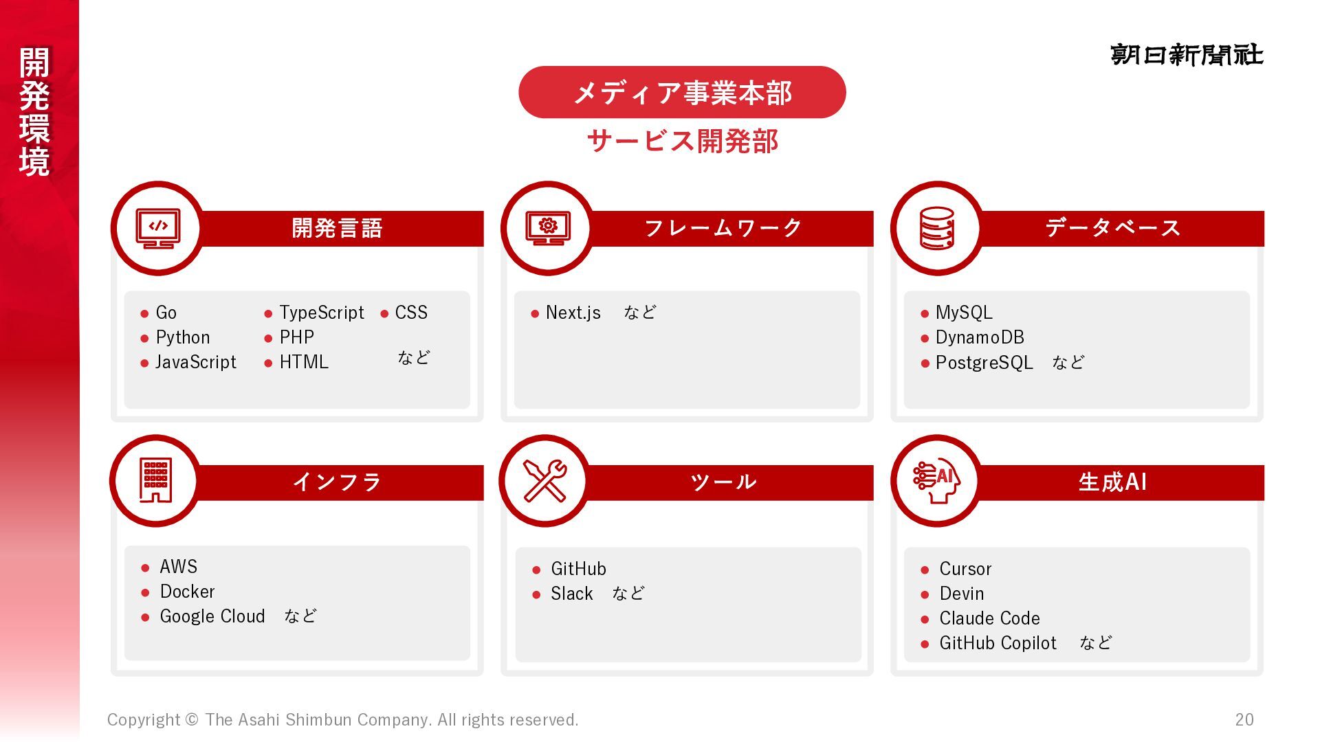 Asahi Shimbun Company. All rights reserved. 開 発 環 境 サービス開発部 メディア事業本部 開発言語 ⚫ TypeScript ⚫ PHP ⚫ HTML ⚫ CSS など フレームワーク データベース インフラ ツール 生成AI ⚫ Cursor ⚫ Devin ⚫ Claude Code ⚫ GitHub Copilot など ⚫ AWS ⚫ Docker ⚫ Google Cloud など ⚫ GitHub ⚫ Slack など ⚫ MySQL ⚫ DynamoDB ⚫ PostgreSQL など ⚫ Next.js など