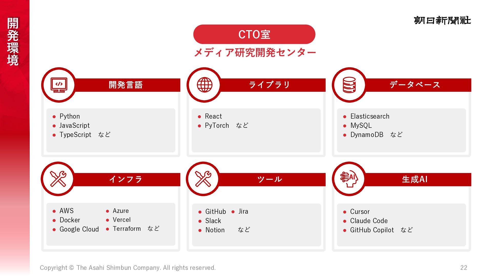 開 発 環 境 ⚫ Python ⚫ JavaScript ⚫ TypeScript など 開発言語 ⚫ React ⚫ PyTorch など ライブラリ ⚫ Elasticsearch ⚫ MySQL ⚫ DynamoDB など データベース インフラ ⚫ AWS ⚫ Docker ⚫ Google Cloud ⚫ Azure ⚫ Vercel ⚫ Terraform など メディア研究開発センター CTO室 ツール ⚫ GitHub ⚫ Slack ⚫ Notion 生成AI ⚫ Cursor ⚫ Claude Code ⚫ GitHub Copilot など ⚫ Jira など