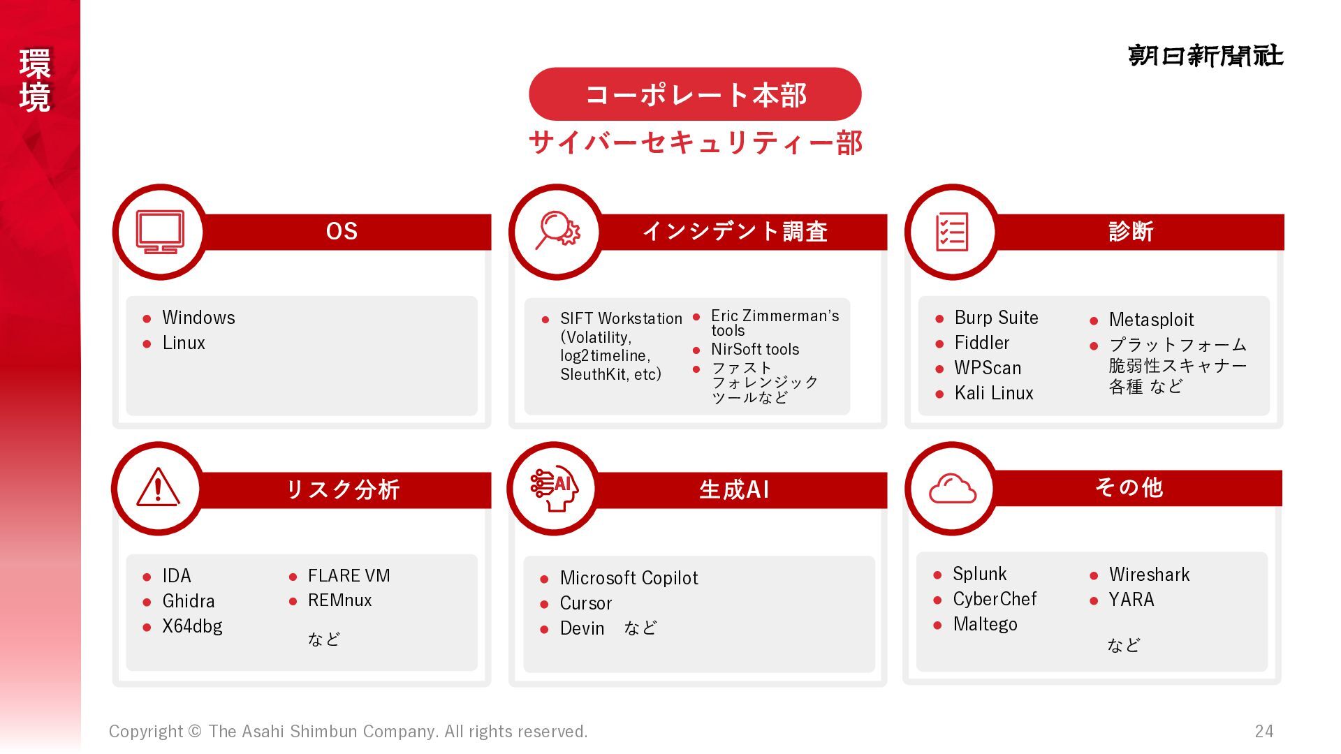 環 境 サイバーセキュリティー部 コーポレート本部 ⚫ Windows ⚫ Linux OS インシデント調査 ⚫ Burp Suite ⚫ Fiddler ⚫ WPScan ⚫ Kali Linux 診断 リスク分析 生成AI ⚫ IDA ⚫ Ghidra ⚫ X64dbg ⚫ FLARE VM ⚫ REMnux など ⚫ Microsoft Copilot ⚫ Cursor ⚫ Devin など ⚫ Metasploit ⚫ プラットフォーム 脆弱性スキャナー 各種 など ⚫ Splunk ⚫ CyberChef ⚫ Maltego その他 ⚫ Wireshark ⚫ YARA など ⚫ SIFT Workstation (Volatility, log2timeline, SleuthKit, etc) ⚫ Eric Zimmerman’s tools ⚫ NirSoft tools ⚫ ファスト フォレンジック ツールなど