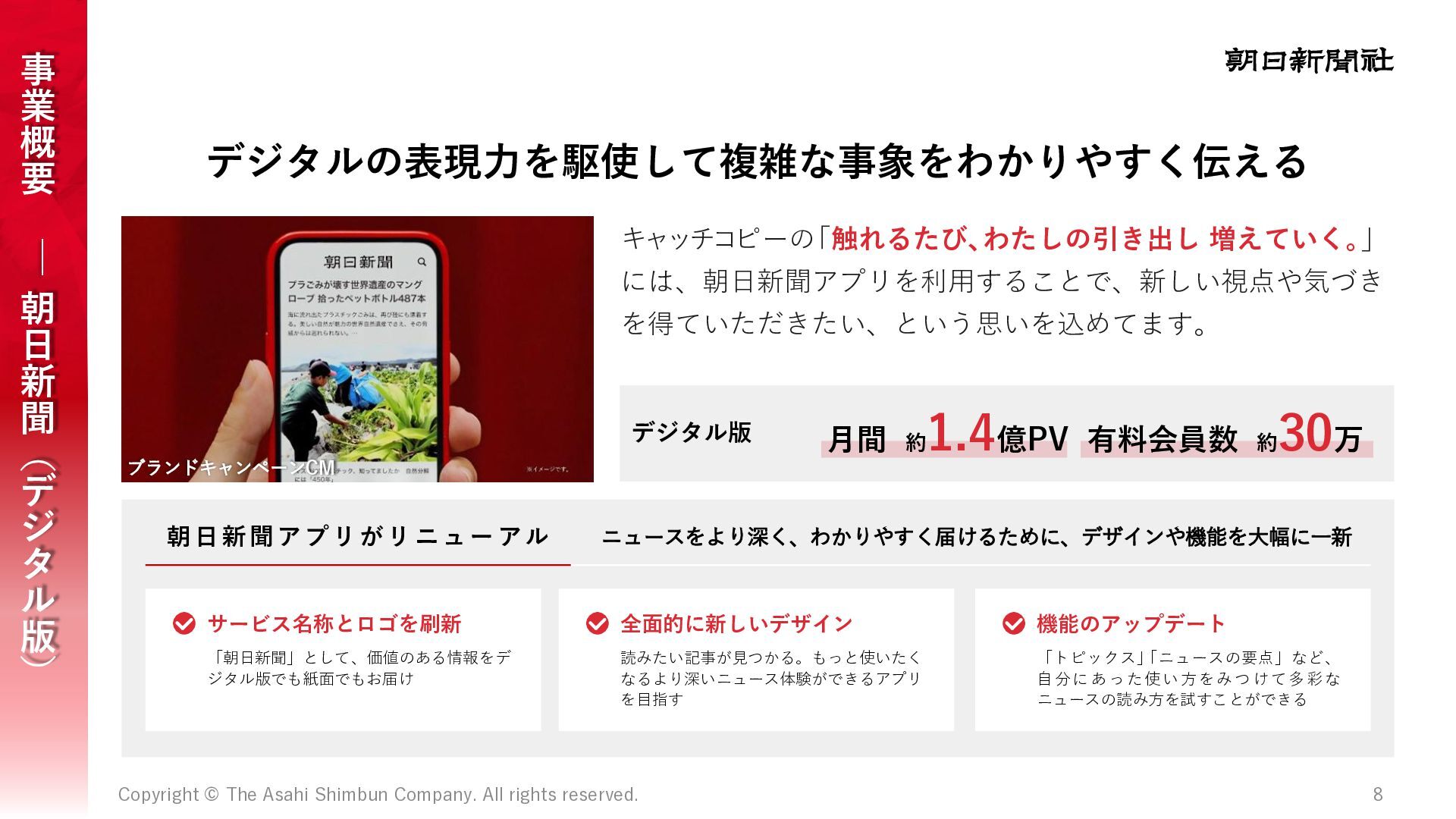 ( デ ジ タ ル 版 ) Copyright © The Asahi Shimbun Company. All rights reserved. デジタルの表現力を駆使して複雑な事象をわかりやすく伝える ブランドキャンペーンCM 朝日新聞アプリがリニューアル ニュースをより深く、わかりやすく届けるために、デザインや機能を大幅に一新 サービス名称とロゴを刷新 「朝日新聞」として、価値のある情報をデ ジタル版でも紙面でもお届け 全面的に新しいデザイン 読みたい記事が見つかる。もっと使いたく なるより深いニュース体験ができるアプリ を目指す 機能のアップデート 「トピックス」 「ニュースの要点」など、 自分にあった使い方をみつけて多彩な ニュースの読み方を試すことができる キャッチコピーの 「触れるたび、 わたしの引き出し 増えていく。 」 には、朝日新聞アプリを利用することで、新しい視点や気づき を得ていただきたい、という思いを込めてます。 デジタル版 月間 約 1.4億PV 有料会員数 約 30万