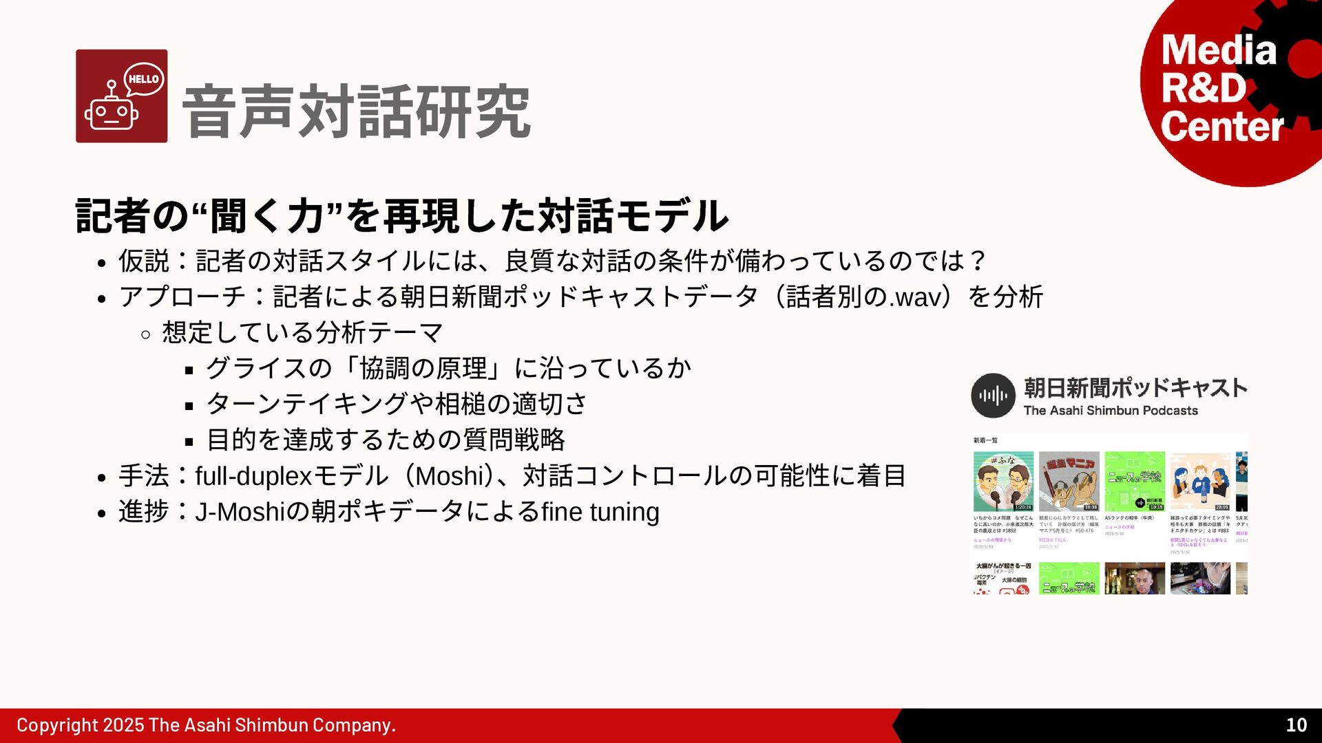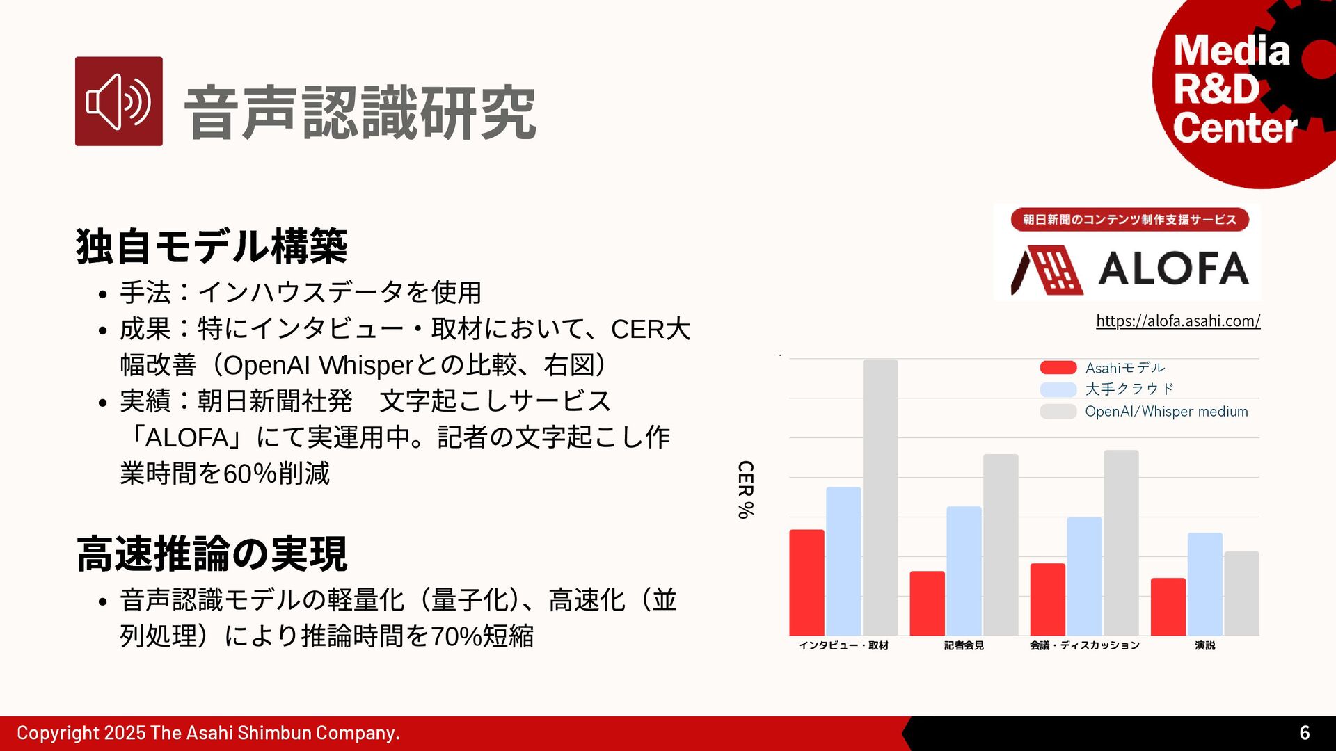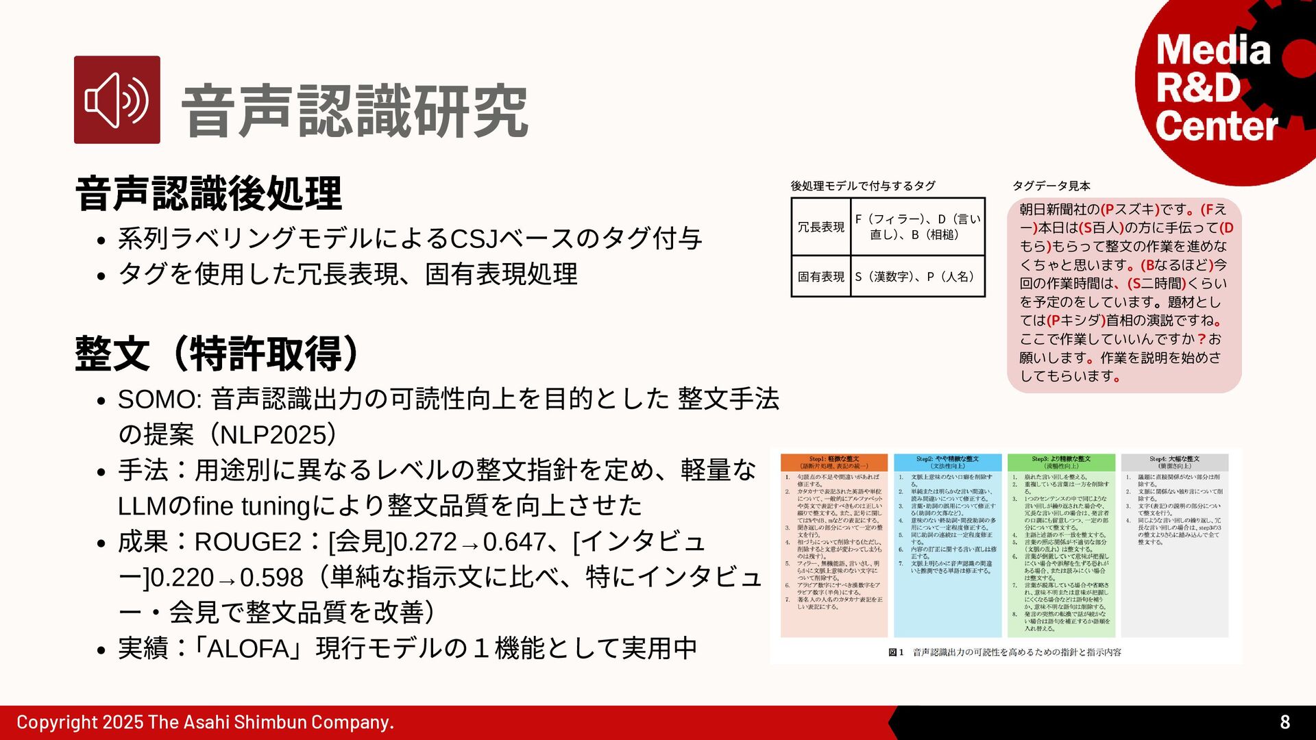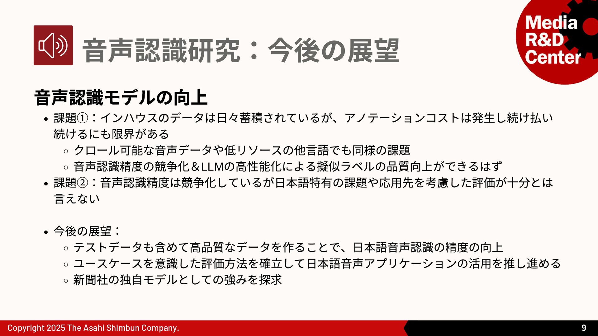 手法:用途別に異なるレベルの整文指針を定め、軽量な LLM のfine tuning により整文品質を向上させた 成果:ROUGE2 :[ 会見]0.272→0.647 、[ インタビュ ー]0.220→0.598 (単純な指示文に比べ、特にインタビュ ー・会見で整文品質を改善) 実績: 「ALOFA 」現行モデルの1機能として実用中 8 冗長表現 F(フィラー) 、D(言い 直し) 、B(相槌) 固有表現 S(漢数字) 、P(人名) 後処理モデルで付与するタグ 朝日新聞社の(Pスズキ)です。(Fえ ー)本日は(S百人)の方に手伝って(D もら)もらって整文の作業を進めな くちゃと思います。(Bなるほど)今 回の作業時間は、(S二時間)くらい を予定のをしています。題材とし ては(Pキシダ)首相の演説ですね。 ここで作業していいんですか?お 願いします。作業を説明を始めさ してもらいます。 タグデータ見本 音声認識研究 Copyright 2025 The Asahi Shimbun Company.