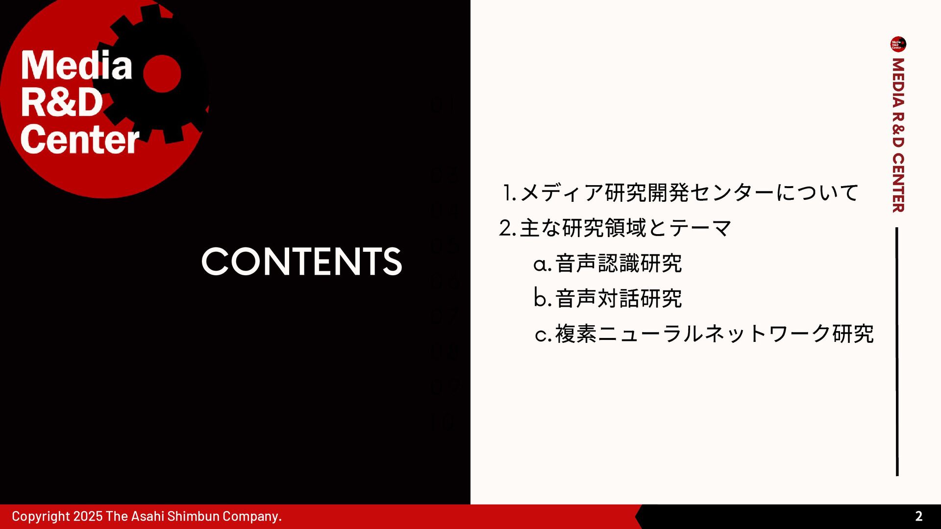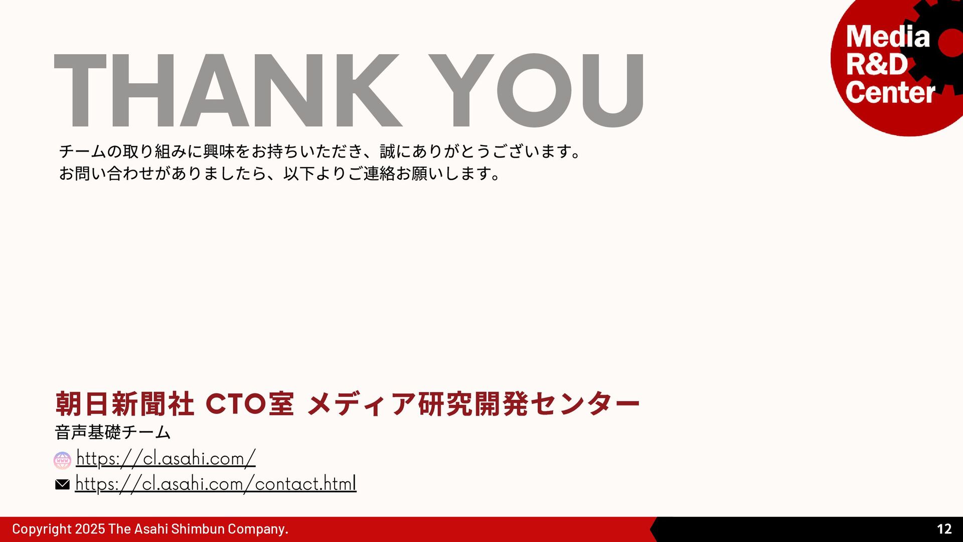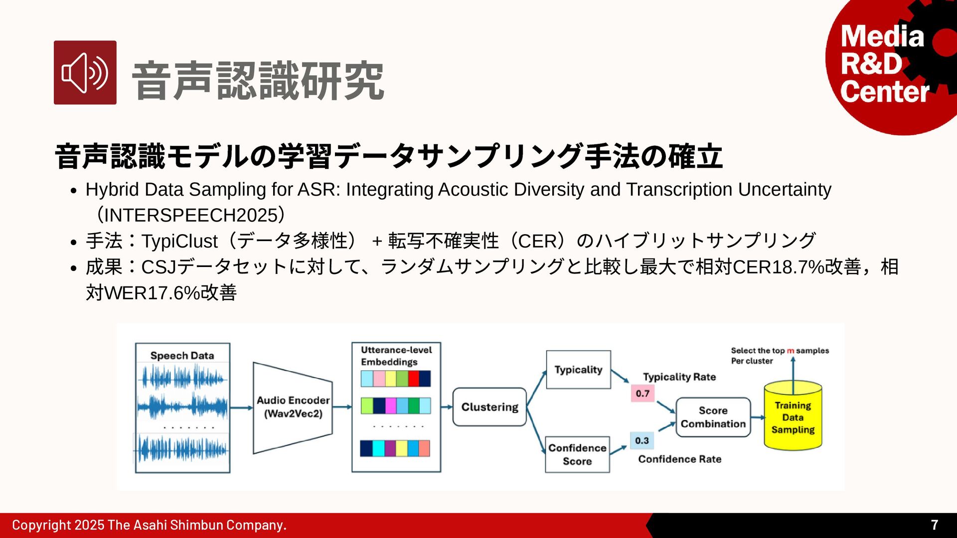 手法:用途別に異なるレベルの整文指針を定め、軽量な LLM のfine tuning により整文品質を向上させた 成果:ROUGE2 :[ 会見]0.272→0.647 、[ インタビュ ー]0.220→0.598 (単純な指示文に比べ、特にインタビュ ー・会見で整文品質を改善) 実績: 「ALOFA 」現行モデルの1機能として実用中 8 冗長表現 F(フィラー) 、D(言い 直し) 、B(相槌) 固有表現 S(漢数字) 、P(人名) 後処理モデルで付与するタグ 朝日新聞社の(Pスズキ)です。(Fえ ー)本日は(S百人)の方に手伝って(D もら)もらって整文の作業を進めな くちゃと思います。(Bなるほど)今 回の作業時間は、(S二時間)くらい を予定のをしています。題材とし ては(Pキシダ)首相の演説ですね。 ここで作業していいんですか?お 願いします。作業を説明を始めさ してもらいます。 タグデータ見本 音声認識研究 Copyright 2025 The Asahi Shimbun Company.