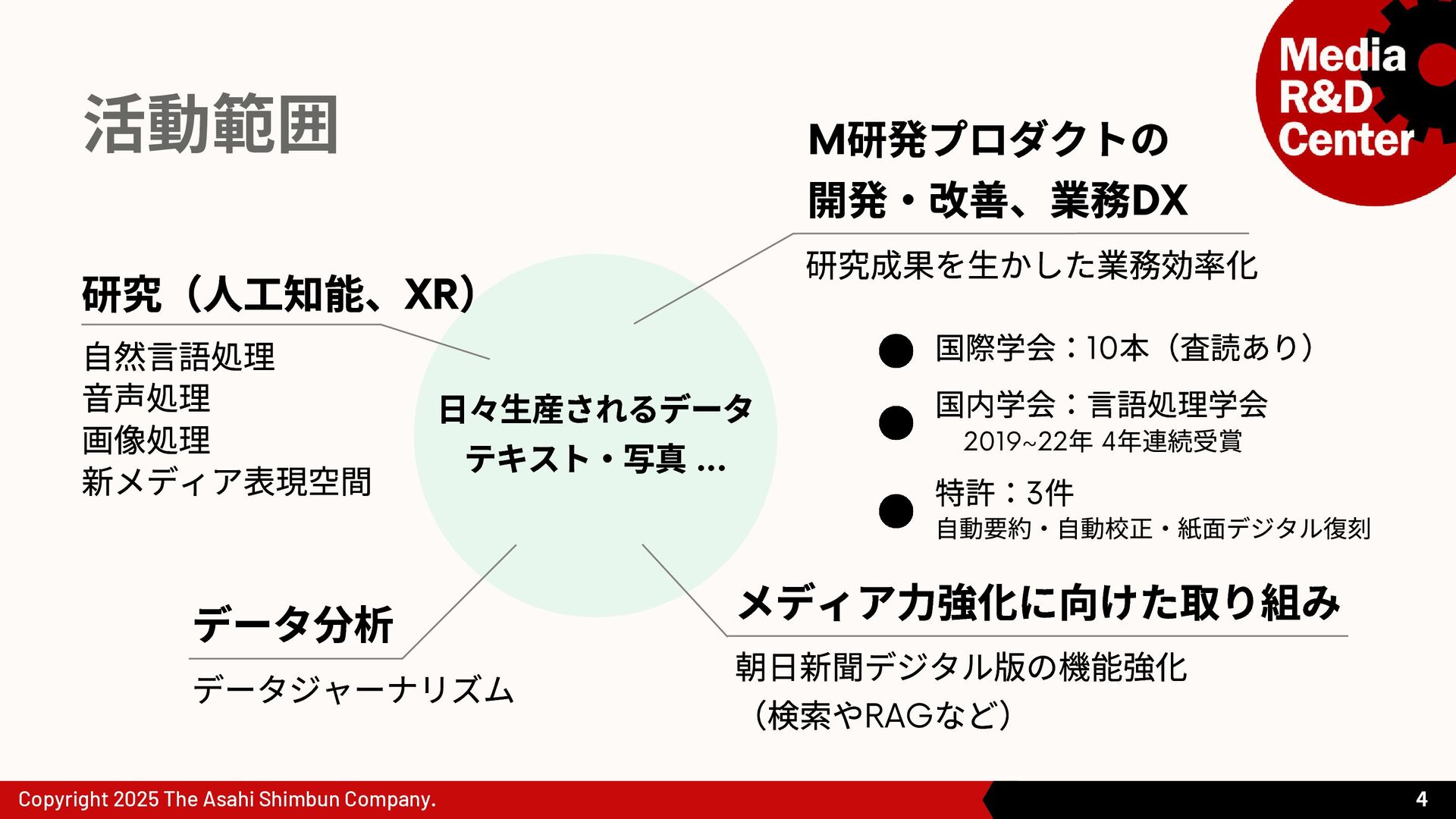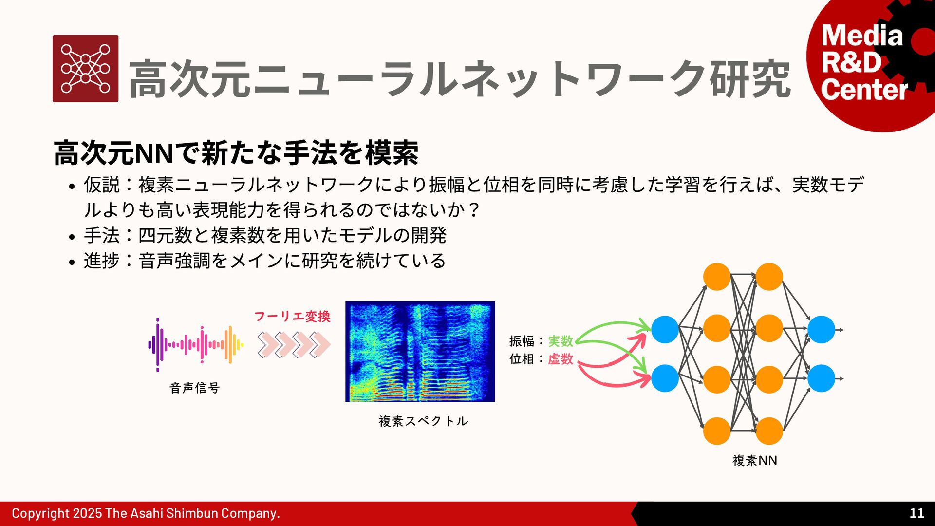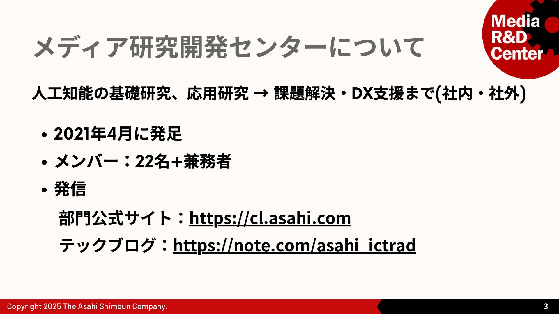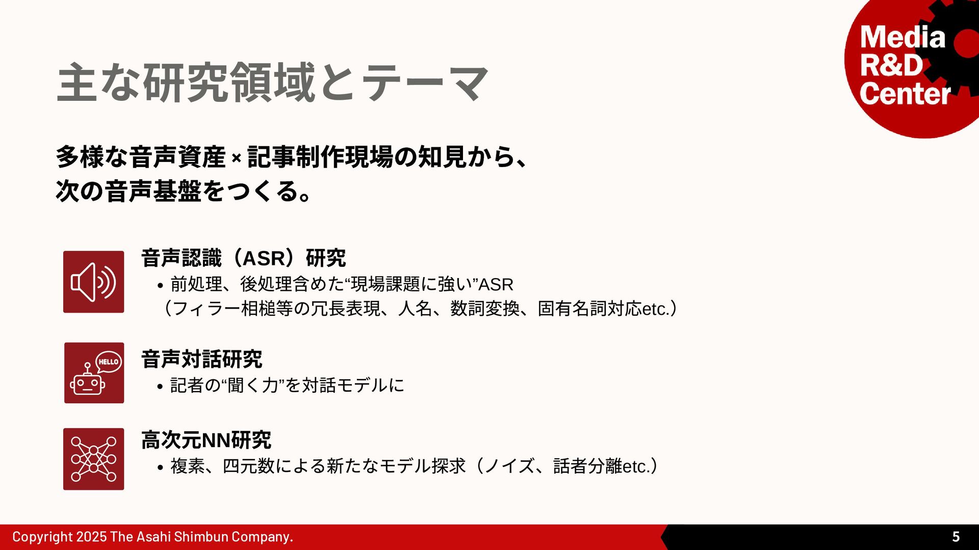 手法:用途別に異なるレベルの整文指針を定め、軽量な LLM のfine tuning により整文品質を向上させた 成果:ROUGE2 :[ 会見]0.272→0.647 、[ インタビュ ー]0.220→0.598 (単純な指示文に比べ、特にインタビュ ー・会見で整文品質を改善) 実績: 「ALOFA 」現行モデルの1機能として実用中 8 冗長表現 F(フィラー) 、D(言い 直し) 、B(相槌) 固有表現 S(漢数字) 、P(人名) 後処理モデルで付与するタグ 朝日新聞社の(Pスズキ)です。(Fえ ー)本日は(S百人)の方に手伝って(D もら)もらって整文の作業を進めな くちゃと思います。(Bなるほど)今 回の作業時間は、(S二時間)くらい を予定のをしています。題材とし ては(Pキシダ)首相の演説ですね。 ここで作業していいんですか?お 願いします。作業を説明を始めさ してもらいます。 タグデータ見本 音声認識研究 Copyright 2025 The Asahi Shimbun Company.