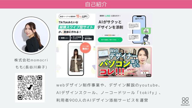 webデザイン制作事業や、デザイン解説のyoutube、 AIデザインスクール、ノーコードツール「tokify」、 利用者900人のAIデザイン添削サービスを運営 株 式 会 社 m o m