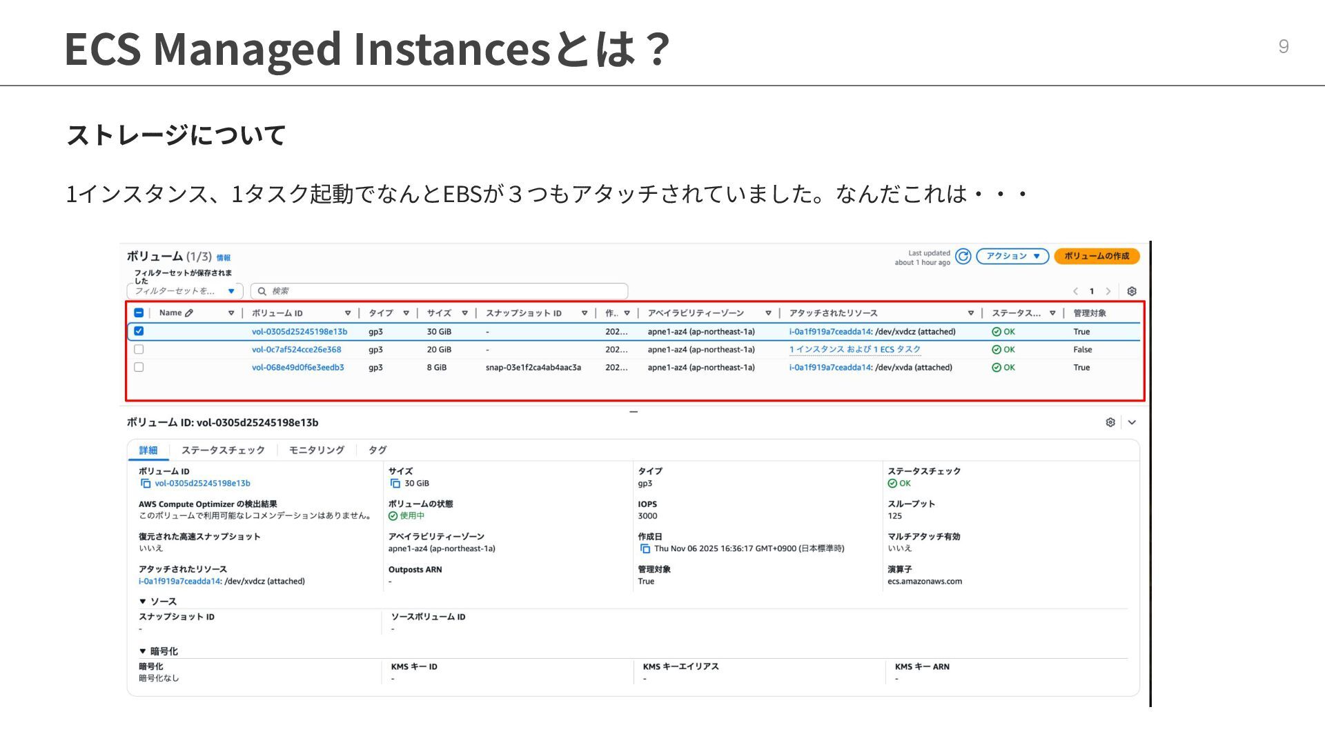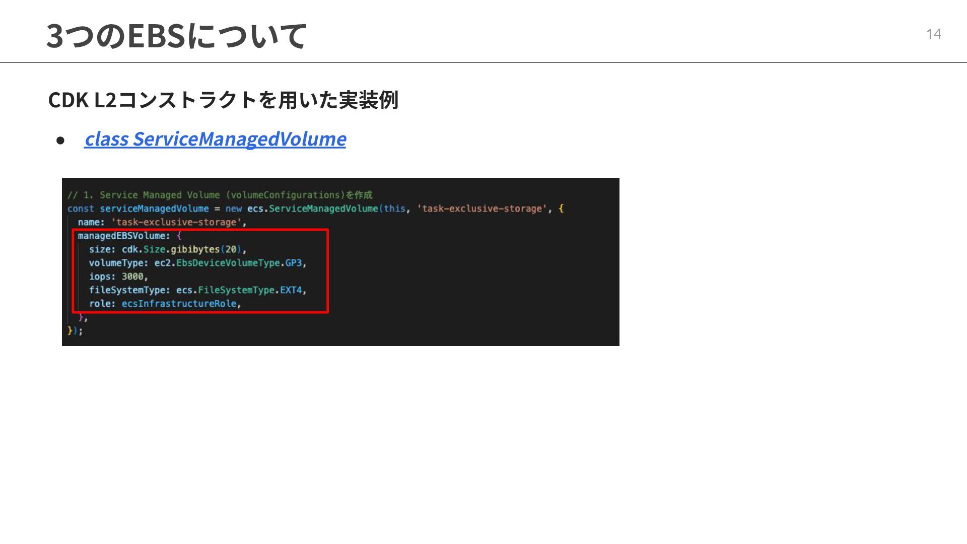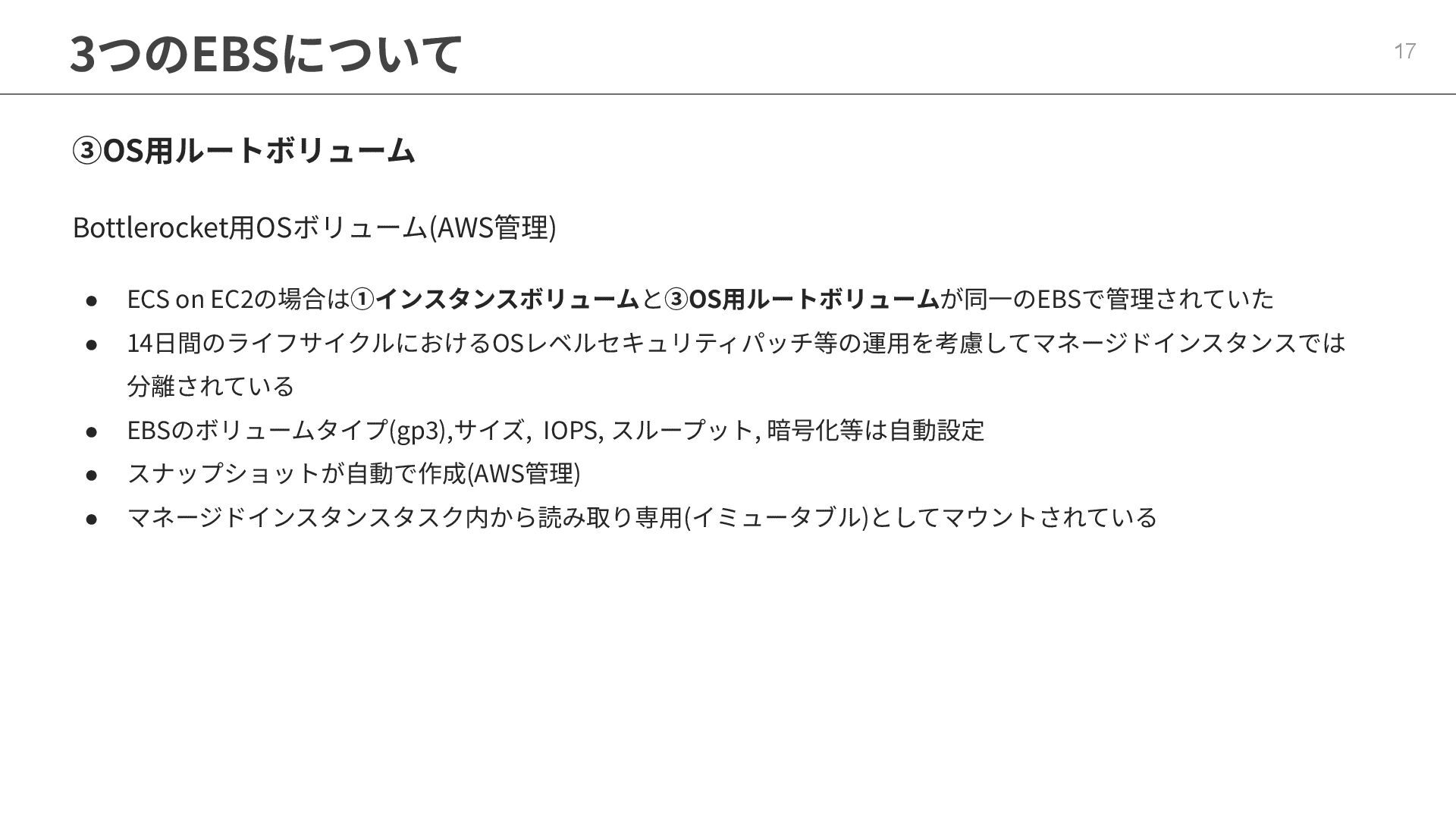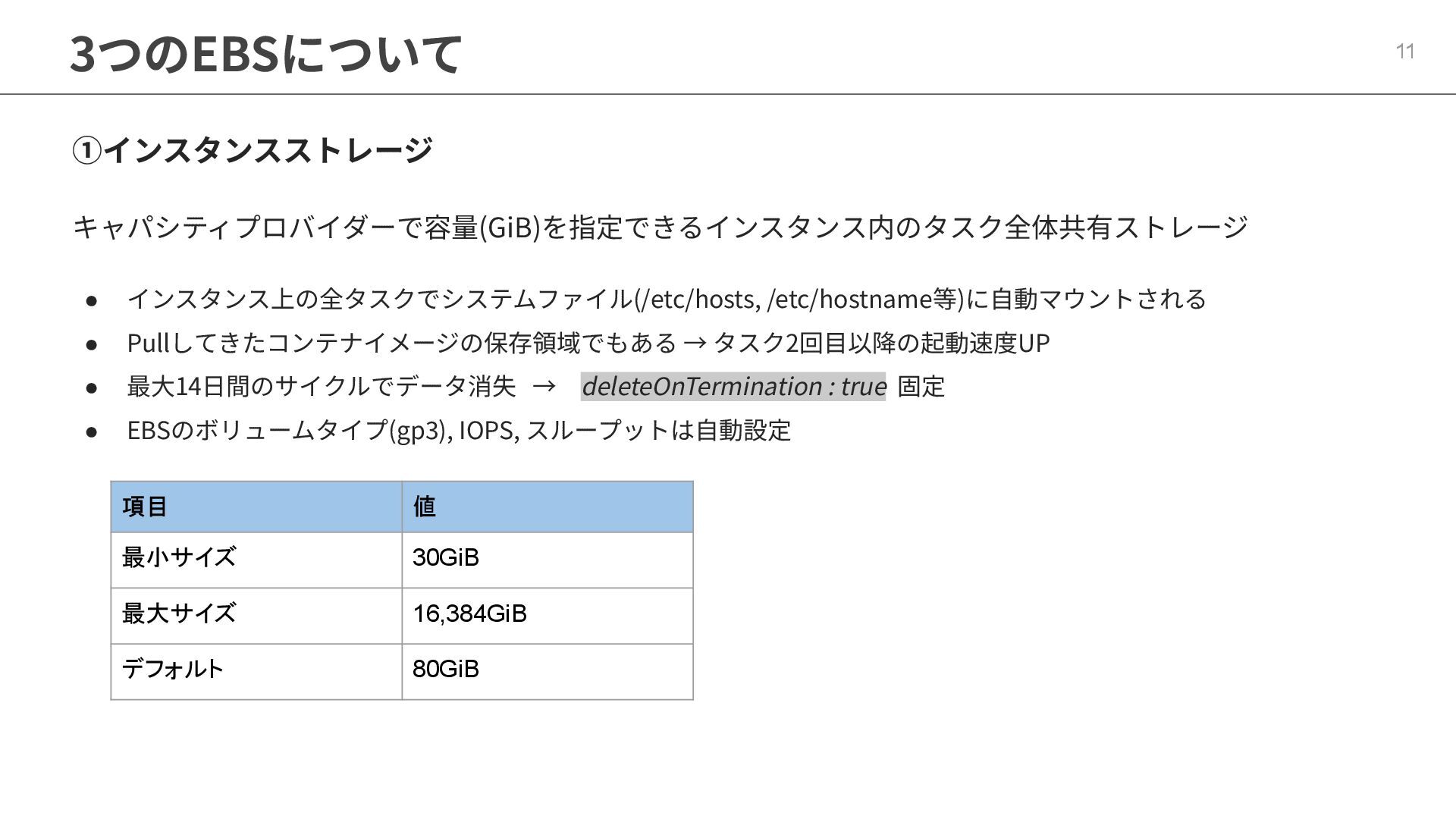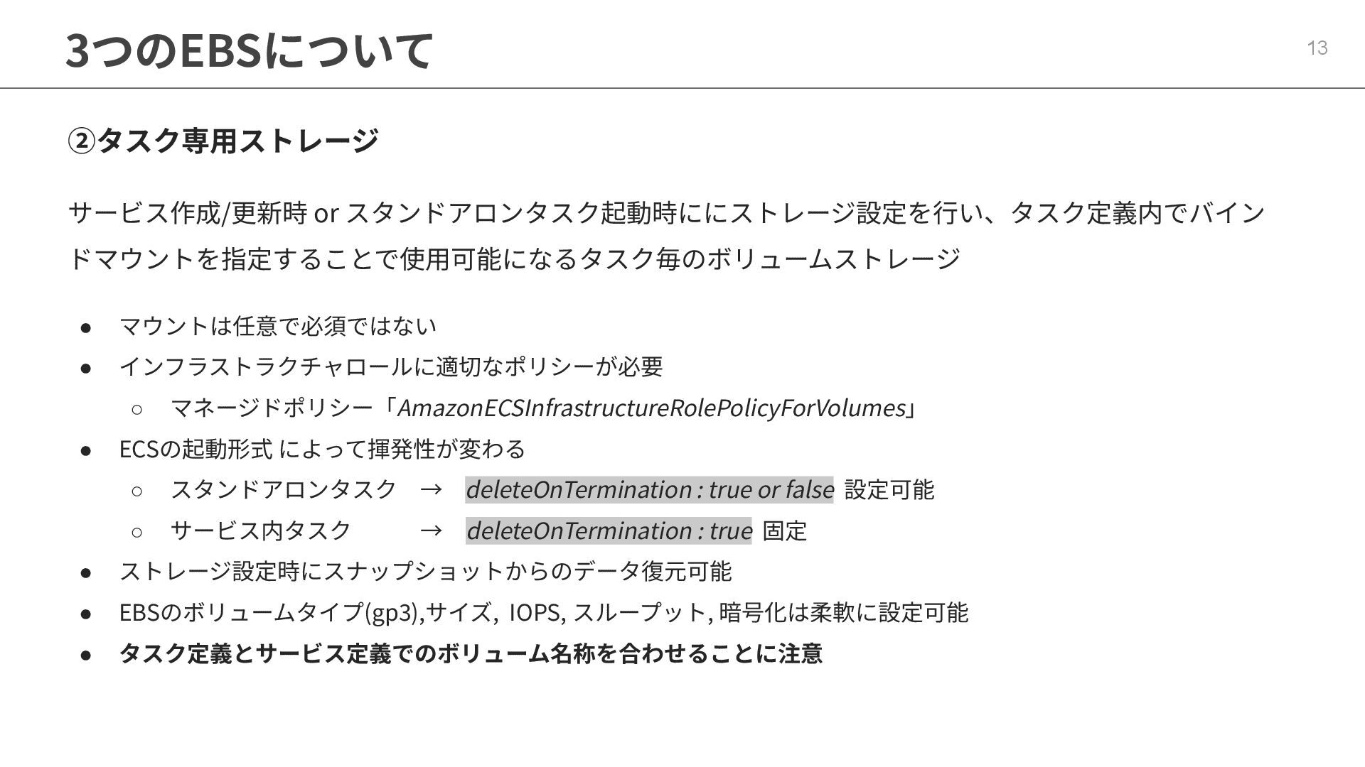 インフラストラクチャロールに適切なポリシーが必要 ◦ マネージドポリシー「AmazonECSInfrastructureRolePolicyForVolumes」 • ECSの起動形式 によって揮発性が変わる ◦ スタンドアロンタスク → deleteOnTermination : true or false 設定可能 ◦ サービス内タスク → deleteOnTermination : true 固定 • ストレージ設定時にスナップショットからのデータ復元可能 • EBSのボリュームタイプ(gp3),サイズ, IOPS, スループット, 暗号化は柔軟に設定可能 • タスク定義とサービス定義でのボリューム名称を合わせることに注意