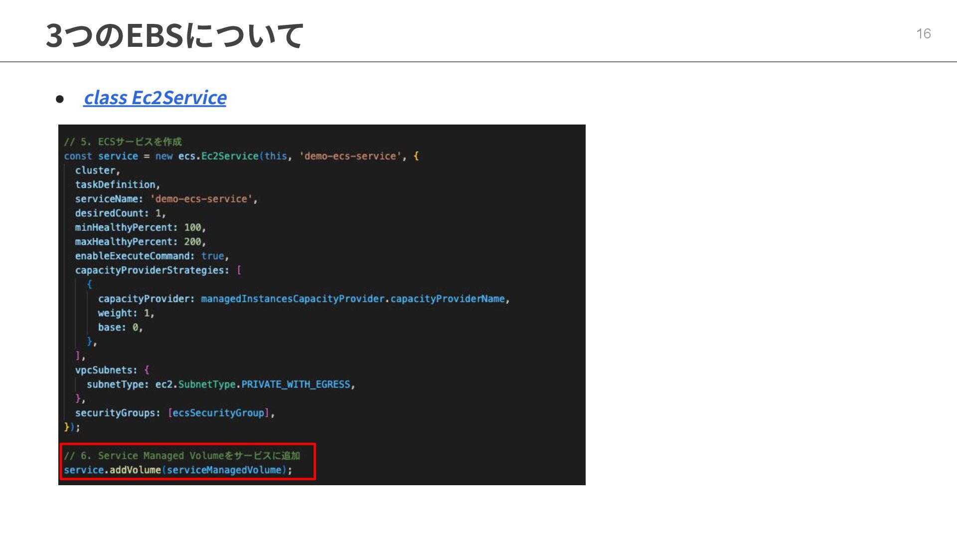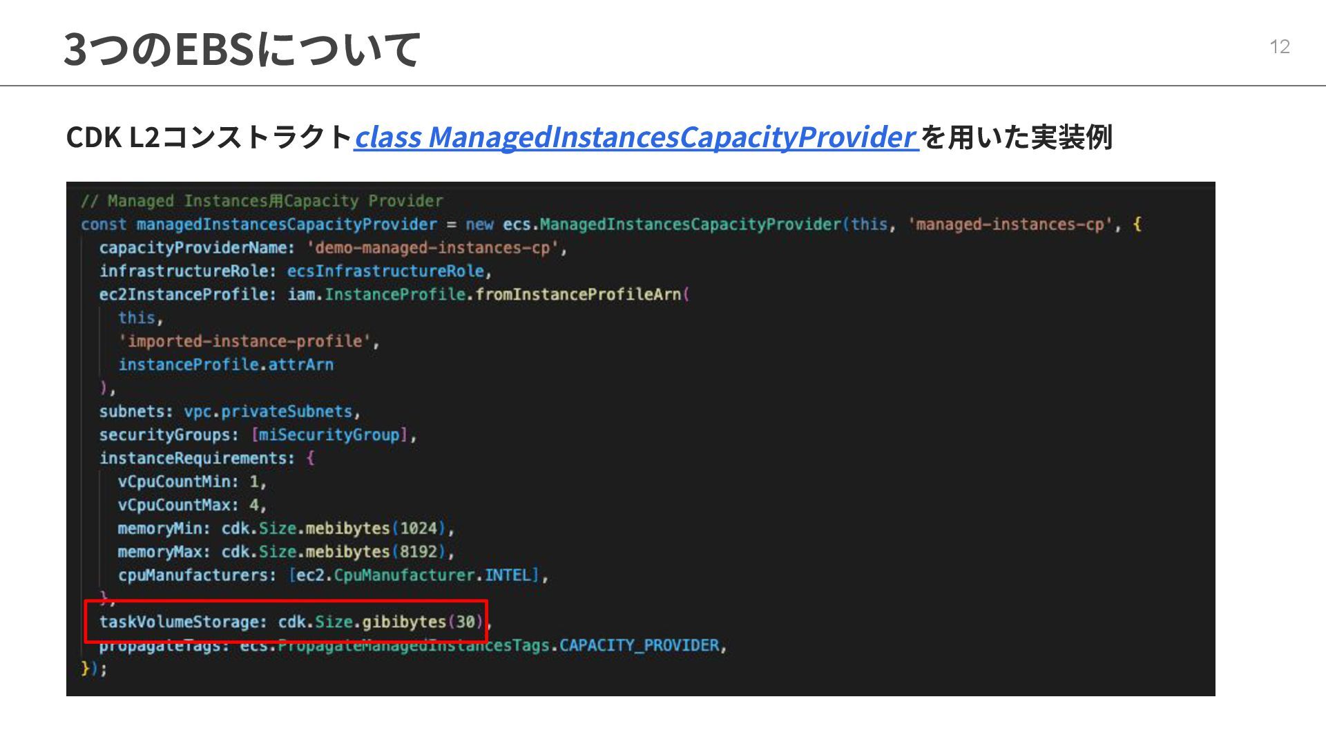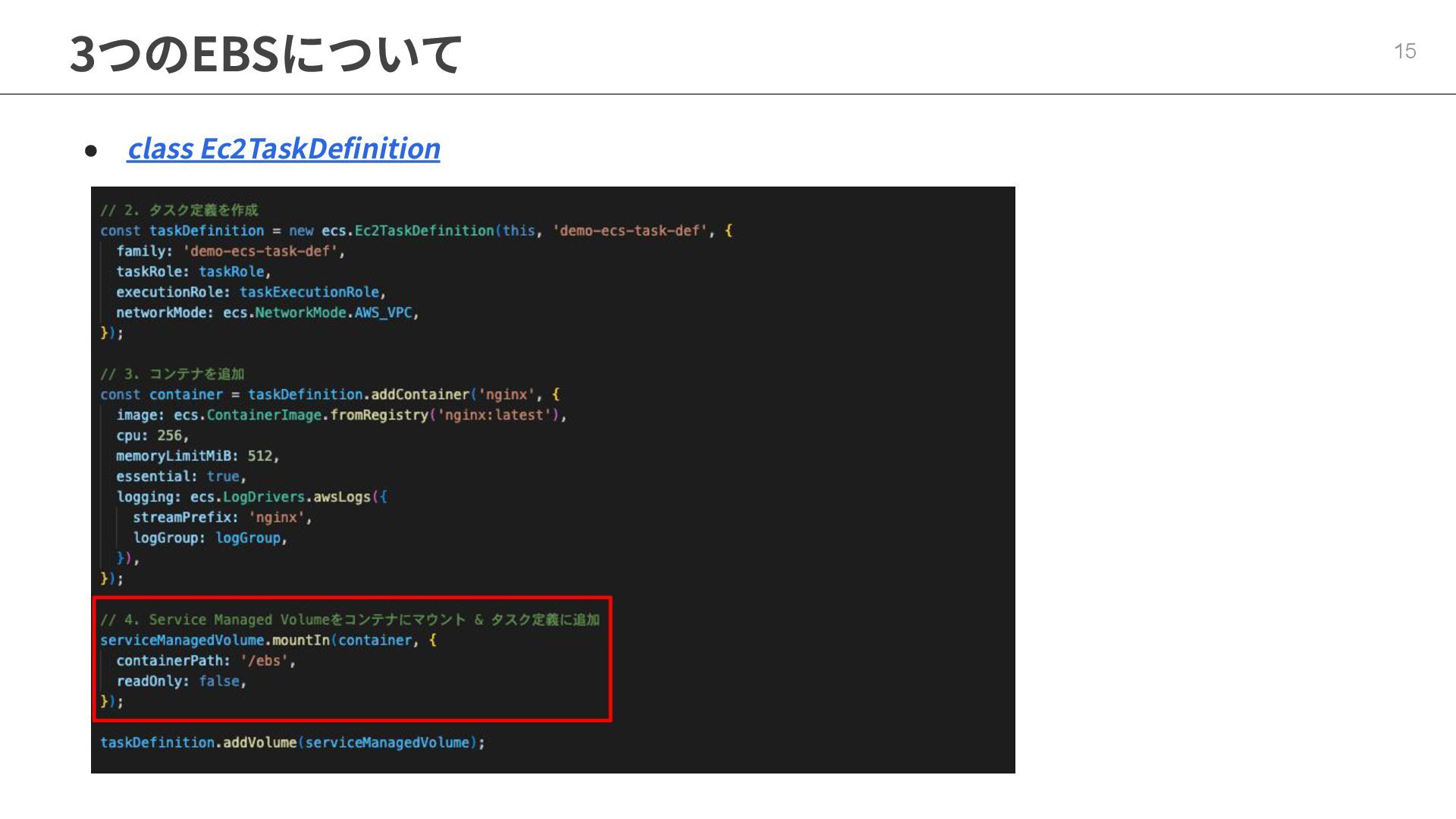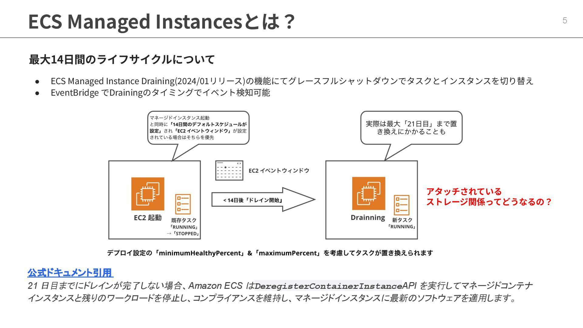 インフラストラクチャロールに適切なポリシーが必要 ◦ マネージドポリシー「AmazonECSInfrastructureRolePolicyForVolumes」 • ECSの起動形式 によって揮発性が変わる ◦ スタンドアロンタスク → deleteOnTermination : true or false 設定可能 ◦ サービス内タスク → deleteOnTermination : true 固定 • ストレージ設定時にスナップショットからのデータ復元可能 • EBSのボリュームタイプ(gp3),サイズ, IOPS, スループット, 暗号化は柔軟に設定可能 • タスク定義とサービス定義でのボリューム名称を合わせることに注意