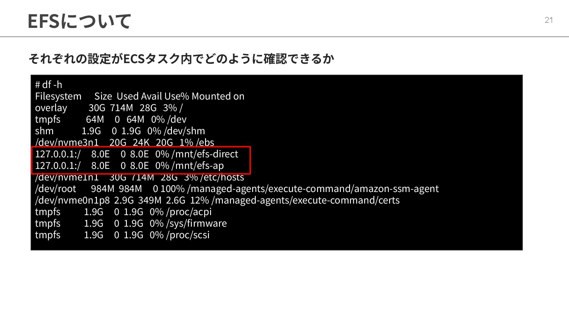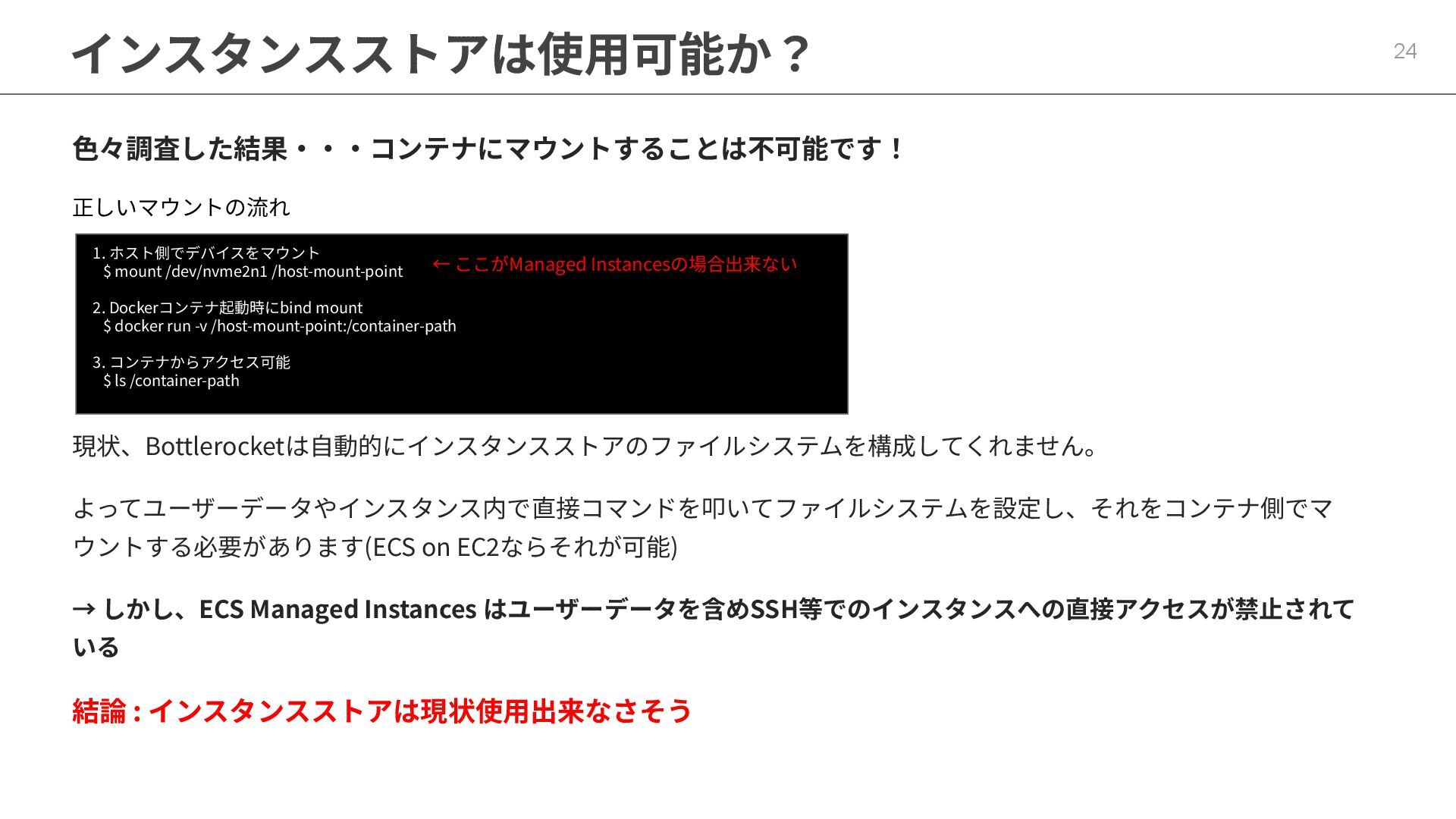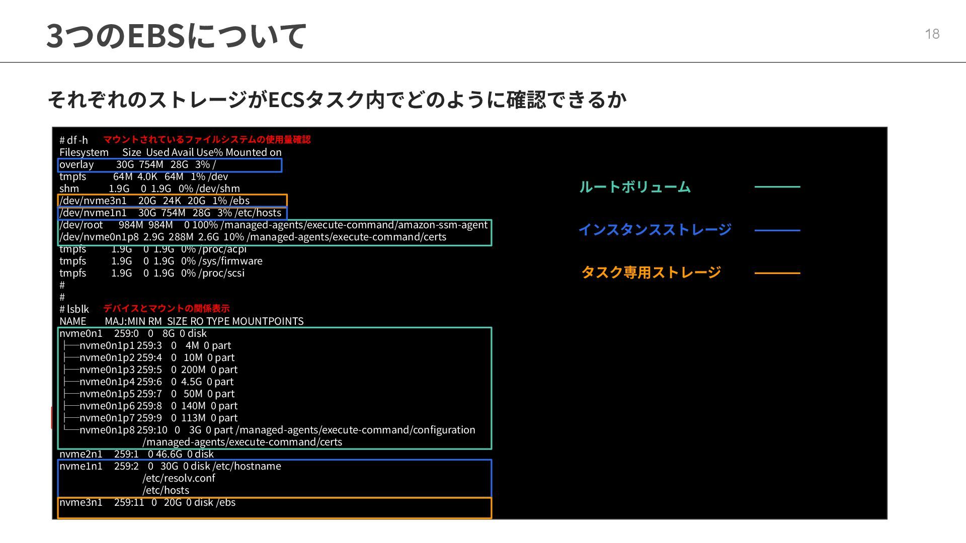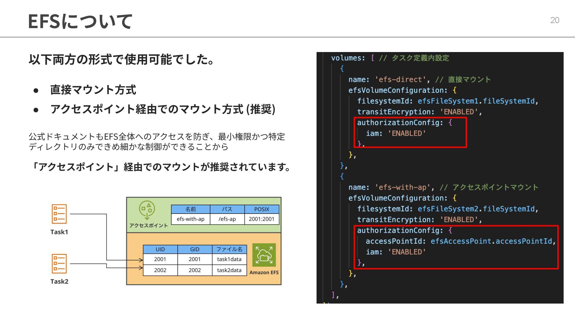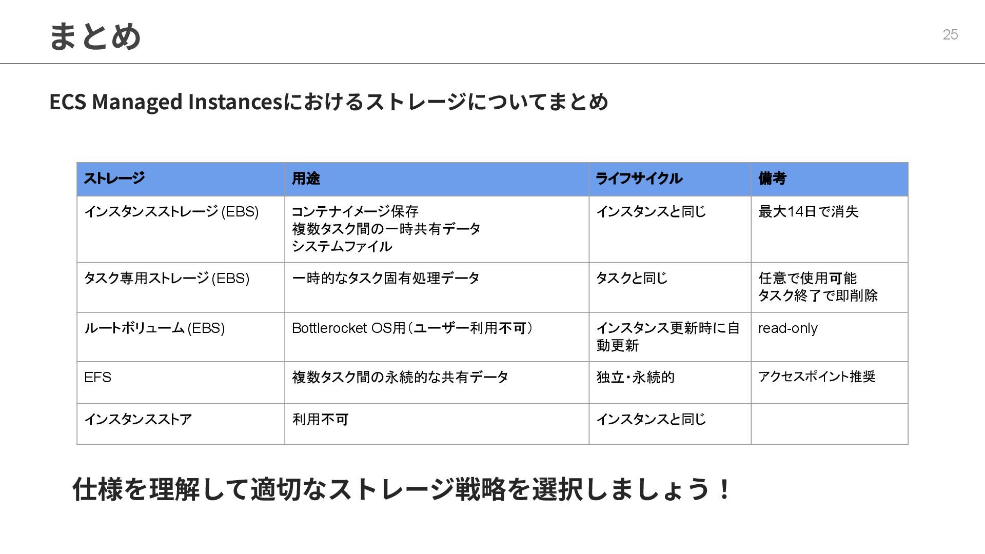 インフラストラクチャロールに適切なポリシーが必要 ◦ マネージドポリシー「AmazonECSInfrastructureRolePolicyForVolumes」 • ECSの起動形式 によって揮発性が変わる ◦ スタンドアロンタスク → deleteOnTermination : true or false 設定可能 ◦ サービス内タスク → deleteOnTermination : true 固定 • ストレージ設定時にスナップショットからのデータ復元可能 • EBSのボリュームタイプ(gp3),サイズ, IOPS, スループット, 暗号化は柔軟に設定可能 • タスク定義とサービス定義でのボリューム名称を合わせることに注意