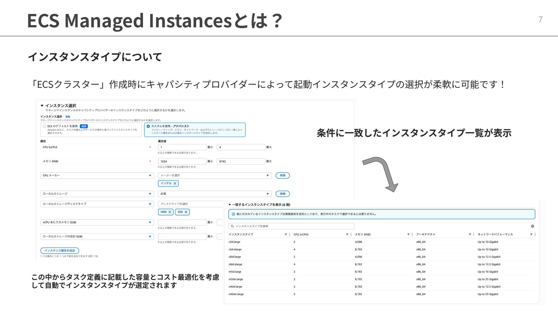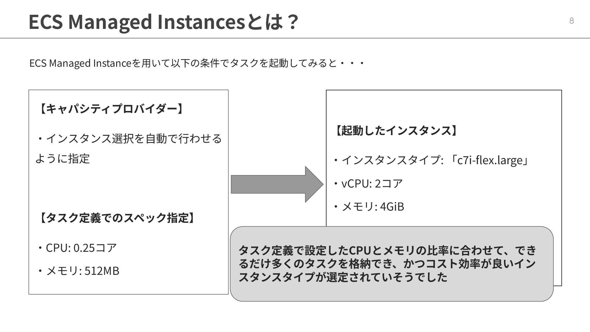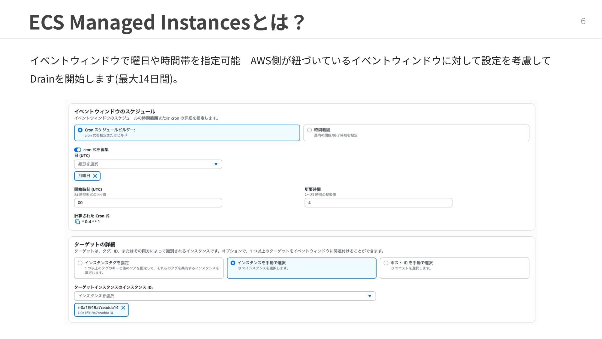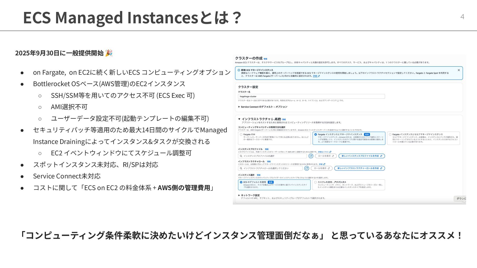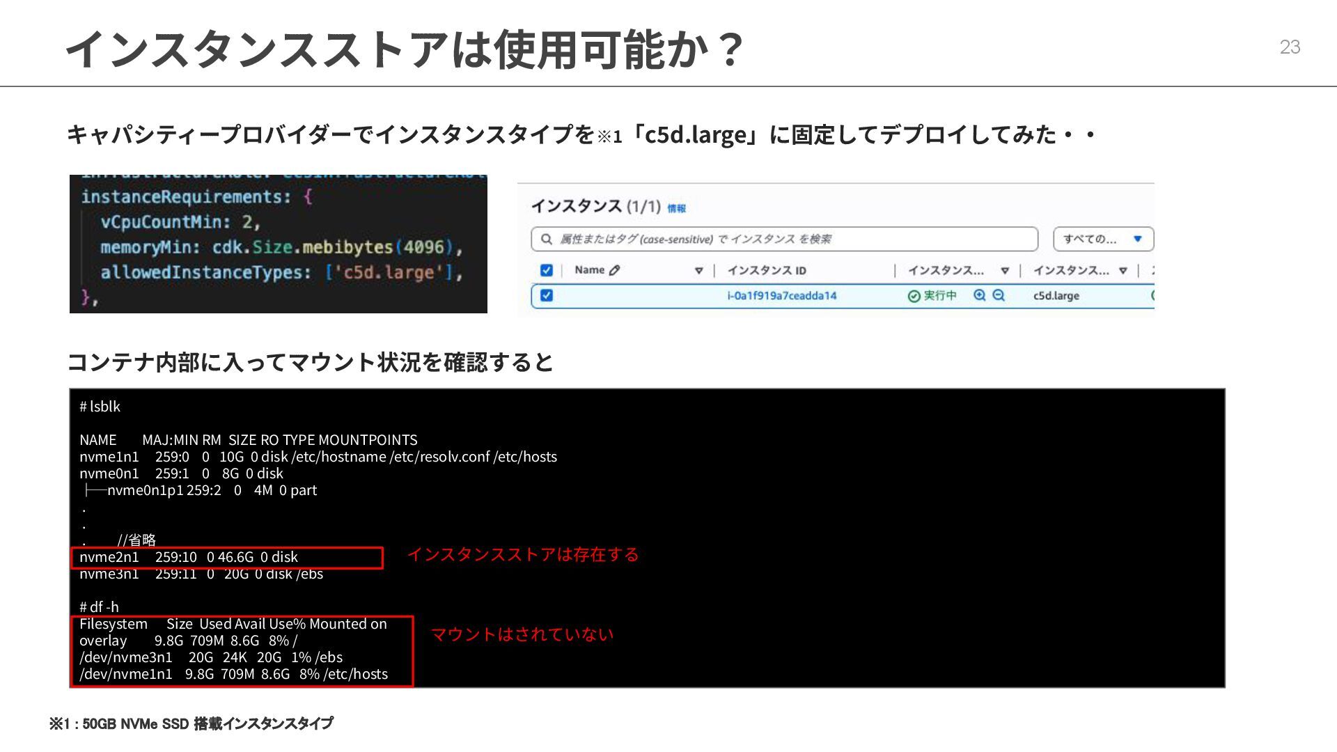 インフラストラクチャロールに適切なポリシーが必要 ◦ マネージドポリシー「AmazonECSInfrastructureRolePolicyForVolumes」 • ECSの起動形式 によって揮発性が変わる ◦ スタンドアロンタスク → deleteOnTermination : true or false 設定可能 ◦ サービス内タスク → deleteOnTermination : true 固定 • ストレージ設定時にスナップショットからのデータ復元可能 • EBSのボリュームタイプ(gp3),サイズ, IOPS, スループット, 暗号化は柔軟に設定可能 • タスク定義とサービス定義でのボリューム名称を合わせることに注意
