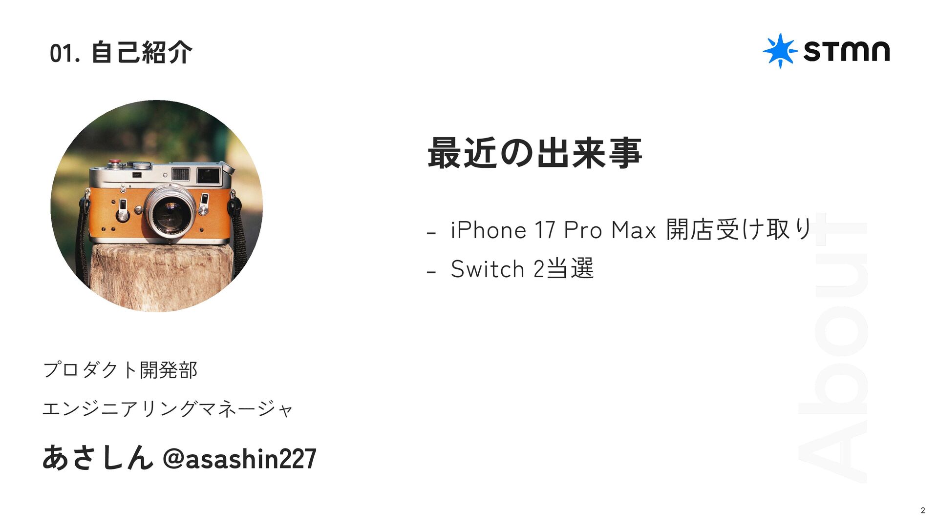 2 プロダクト開発部 エンジニアリングマネージャ あさしん @asashin227 最近の出来事 - iPhone 17 Pro