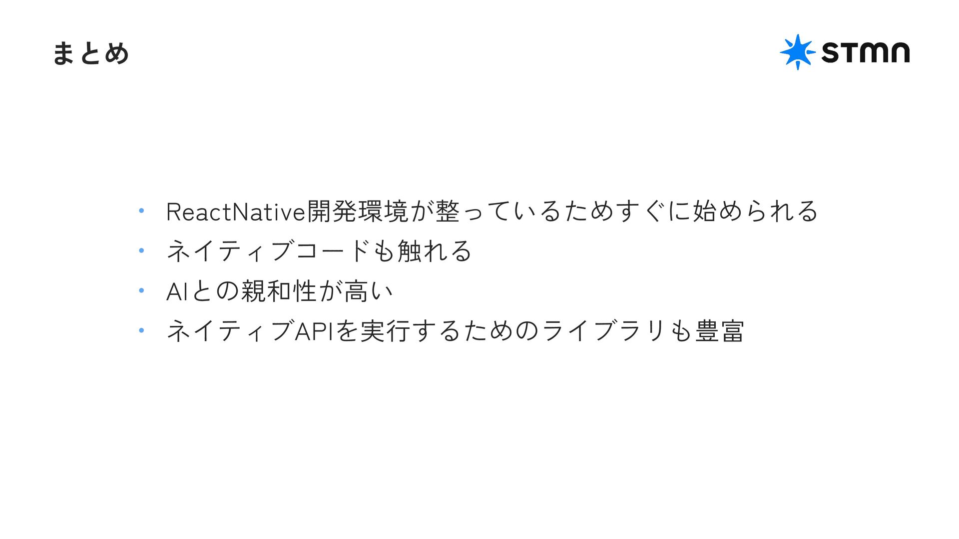 まとめ • ReactNative開発環境が整っているためすぐに始められる • ネイティブコードも触れる • AIとの親和性が高い • ネイティブAPIを実行するためのライブラリも豊富