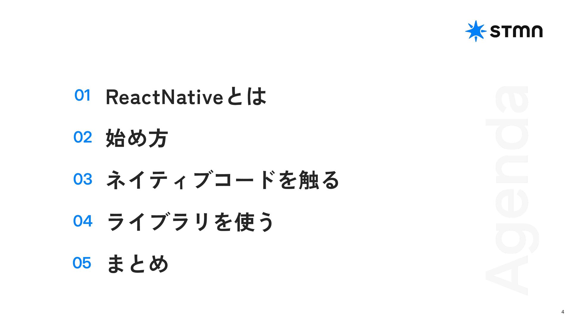 01 02 03 04 05 まとめ 4 ReactNativeとは 始め方 ネイティブコードを触る
