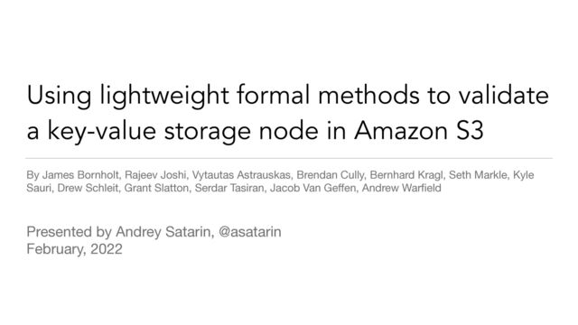 in Amazon S3 By James Bornholt, Rajeev Joshi, Vytautas Astrauskas, Brendan Cully, Bernhard Kragl, Seth Markle, Kyle Sauri, Drew Schleit, Grant Slatton, Serdar Tasiran, Jacob Van Ge ff en, Andrew War fi eld Presented by Andrey Satarin, @asatarin February, 2022
