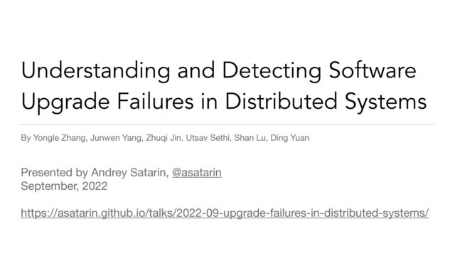 https://asatarin.github.io/talks/2022-09-upgrade-failures-in-distributed- systems • “Understanding and Detecting Software Upgrade Failures in Distributed Systems” paper https://dl.acm.org/doi/10.1145/3477132.3483577 • Talk at SOSP 2021 https://youtu.be/29-isLcDtL0 • Reference repository for the paper https://github.com/zlab-purdue/ds- upgrade 38