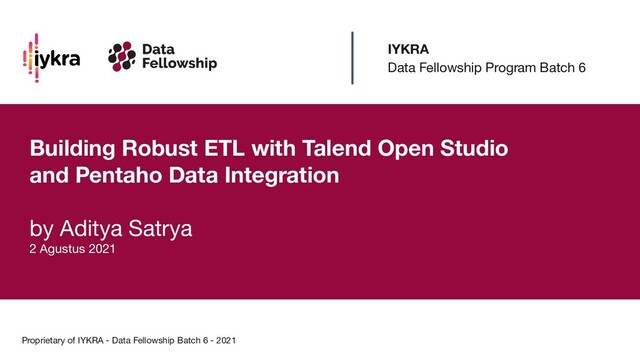 Build job + Run in command line + Override parameters Proprietary of IYKRA - Data Fellowship Batch 6 - 2021 • Case: ◦ We will use external orchestrator (ie: Airflow) to run Pentaho jobs ◦ The job will be executed every month, immediately after a month period ends • Expected to run in command line: ./pan.sh \ -file <path-to-file>/lab_04_etl.ktr \ -param:period_start=2006-02-01 \ -param:period_end=2006-02-28