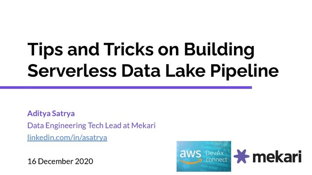 My presentation at the sharing session on AWS DevAx Connect. We shared some lessons learned on building a Data Lake Pipeline on top of AWS services, and how it helps the Data team at Mekari delivers business value faster.