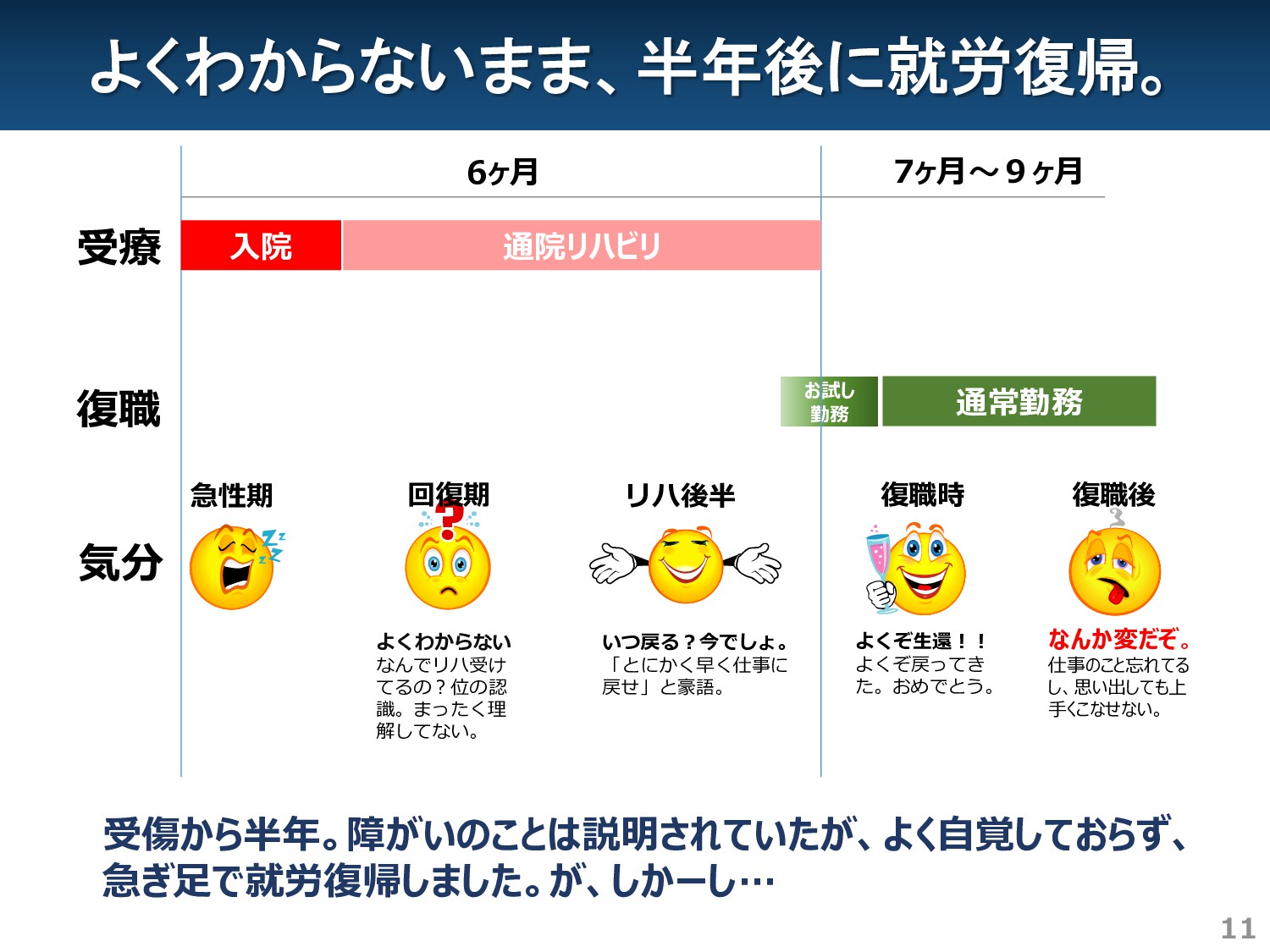 てるの?位の認 識。まったく理 解してない。 回復期 いつ戻る?今でしょ。 「とにかく早く仕事に 戻せ」と豪語。 リハ後半 よくぞ生還!! よくぞ戻ってき た。おめでとう。 復職時 急性期 受傷から半年。障がいのことは説明されていたが、よく自覚しておらず、 急ぎ足で就労復帰しました。が、しかーし… 入院 通院リハビリ 7ヶ月~9ヶ月 なんか変だぞ。 仕事のこと忘れてる し、思い出しても上 手くこなせない。 復職後 11