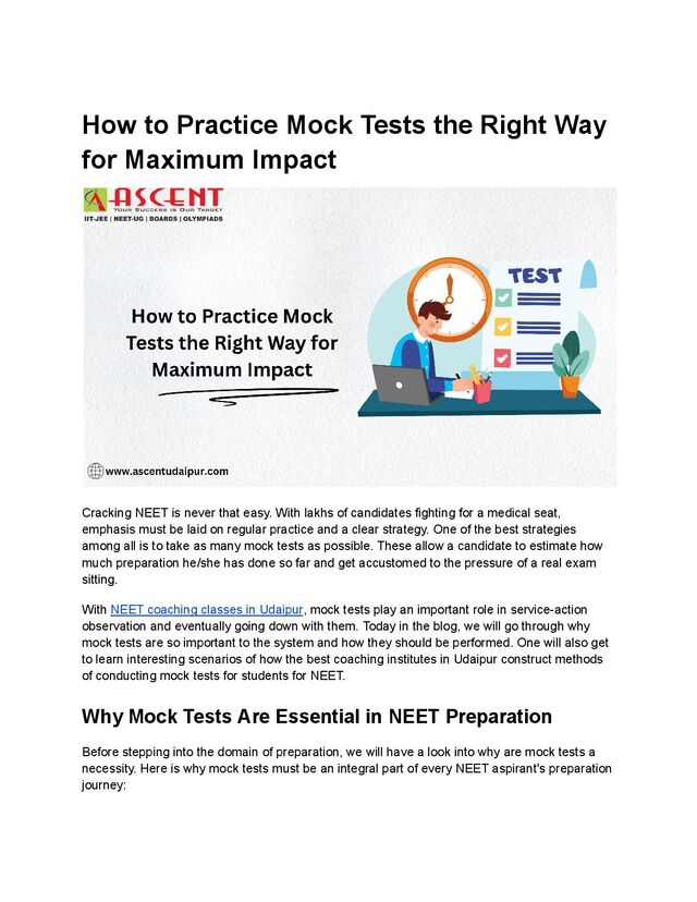 Impact Cracking NEET is never that easy. With lakhs of candidates fighting for a medical seat, emphasis must be laid on regular practice and a clear strategy. One of the best strategies among all is to take as many mock tests as possible. These allow a candidate to estimate how much preparation he/she has done so far and get accustomed to the pressure of a real exam sitting. With NEET coaching classes in Udaipur, mock tests play an important role in service-action observation and eventually going down with them. Today in the blog, we will go through why mock tests are so important to the system and how they should be performed. One will also get to learn interesting scenarios of how the best coaching institutes in Udaipur construct methods of conducting mock tests for students for NEET. Why Mock Tests Are Essential in NEET Preparation Before stepping into the domain of preparation, we will have a look into why are mock tests a necessity. Here is why mock tests must be an integral part of every NEET aspirant's preparation journey: