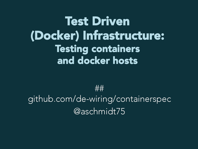 Test driven development is common sense, test driven infrastructure not. Using serverspec and related tools, it becomes really ease to test a docker setup, starting from the host, dockerd, its images and containers, and the container contents itself. References : http://www.infrabricks.de/blog/2015/04/16/docker-container-mit-serverspetesten-teil-2/ https://github.com/de-wiring/containerspec