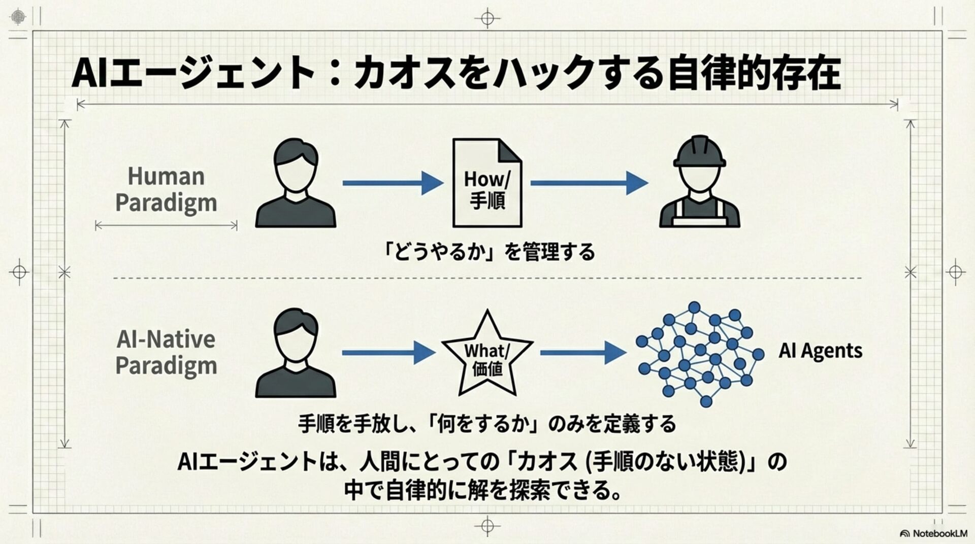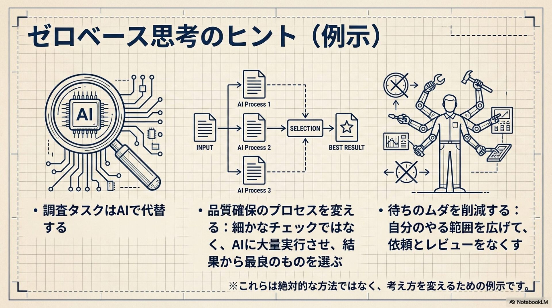 AIのある生活 ーエンジニアのいらない時代のエンジニアの働き方ー の登壇資料です 資料単体で完結するものではなく、ワークショップの中で「AI を前提としたゼロベースなワークフローの再構築」の考え方を説明するためのものです。 この資料は NotebookLM を用いて作成しました。