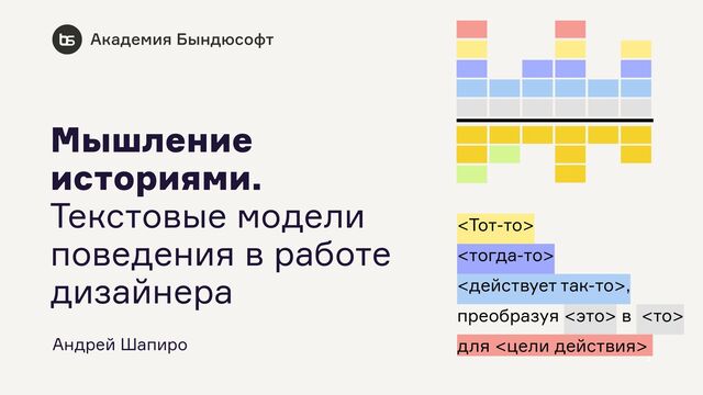 как дизайнер продукта и интерфейса —Автор методик проектирования: Карта процесса-опыта, Карта реализации историй, Дерево гипотез развития, Метод ключевых действий —Автор книги «Карта процесса-опыта» —Арт-директор, методолог, соучредитель Бындюсофт Андрей Шапиро