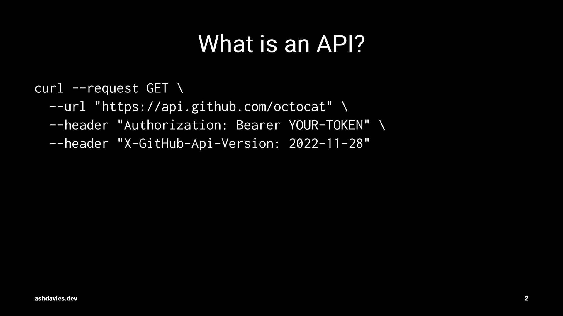 \ --header "Authorization: Bearer YOUR-TOKEN" \ --header "X-GitHub-Api-Version: 2022-11-28" ashdavies.dev 2