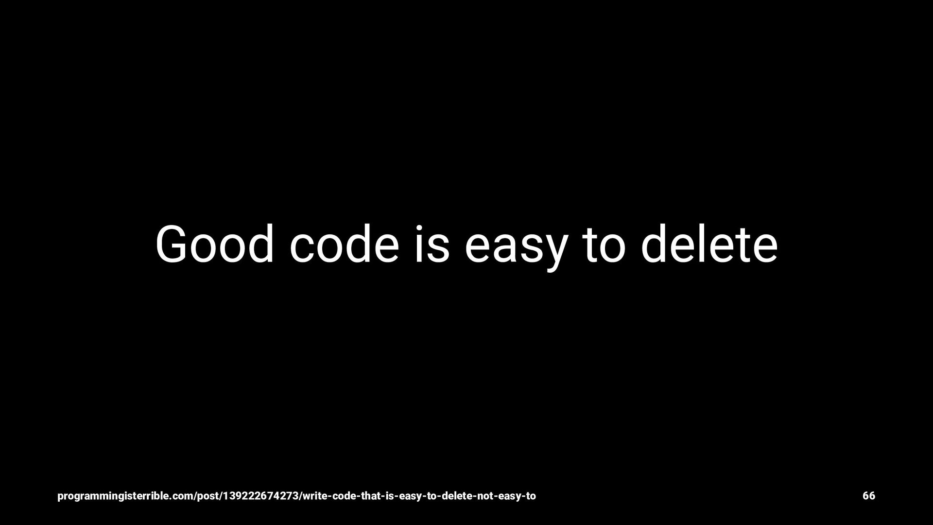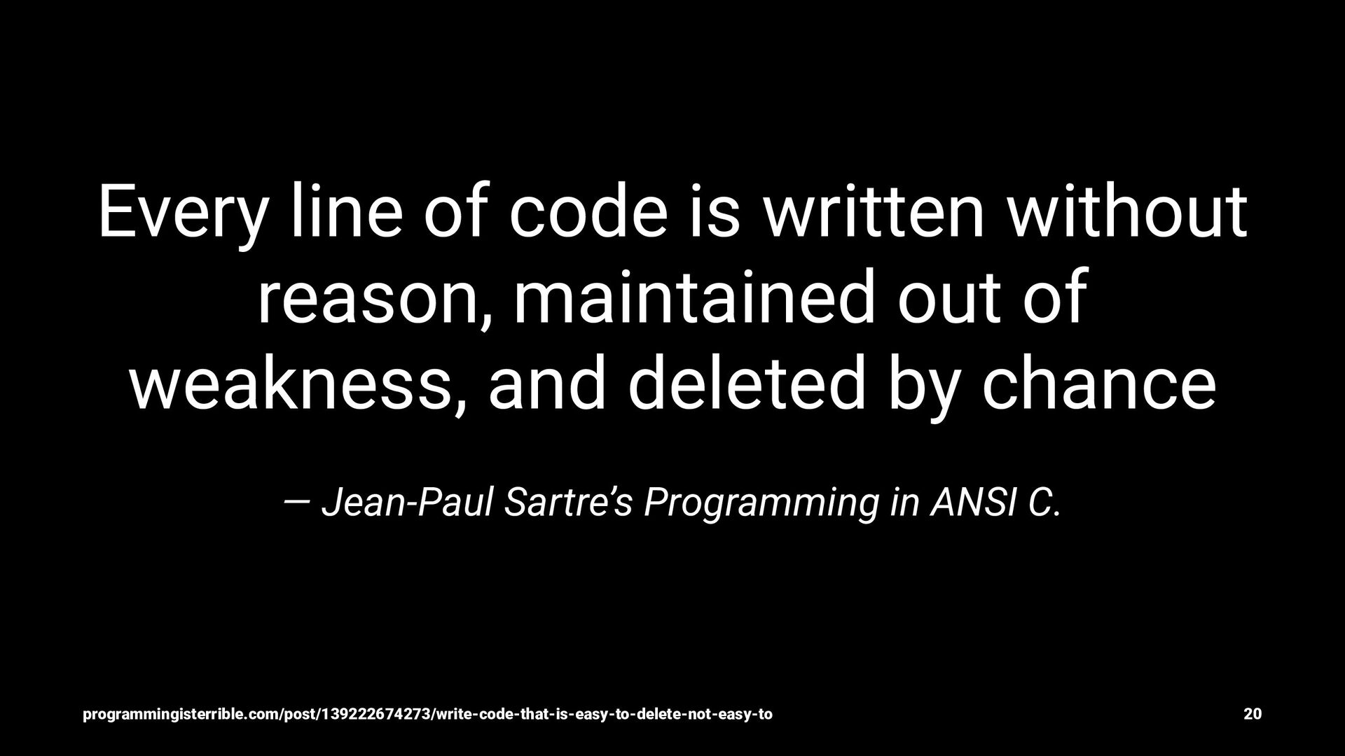 of weakness, and deleted by chance — Jean-Paul Sartre’s Programming in ANSI C. programmingisterrible.com/post/139222674273/write-code-that-is-easy-to-delete-not-easy-to 20