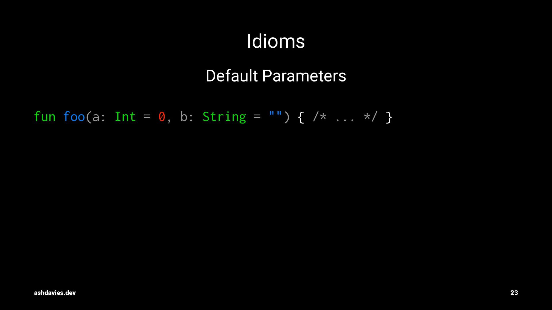 4. Idioms Default Parameters fun foo(a: Int = 0, b: String