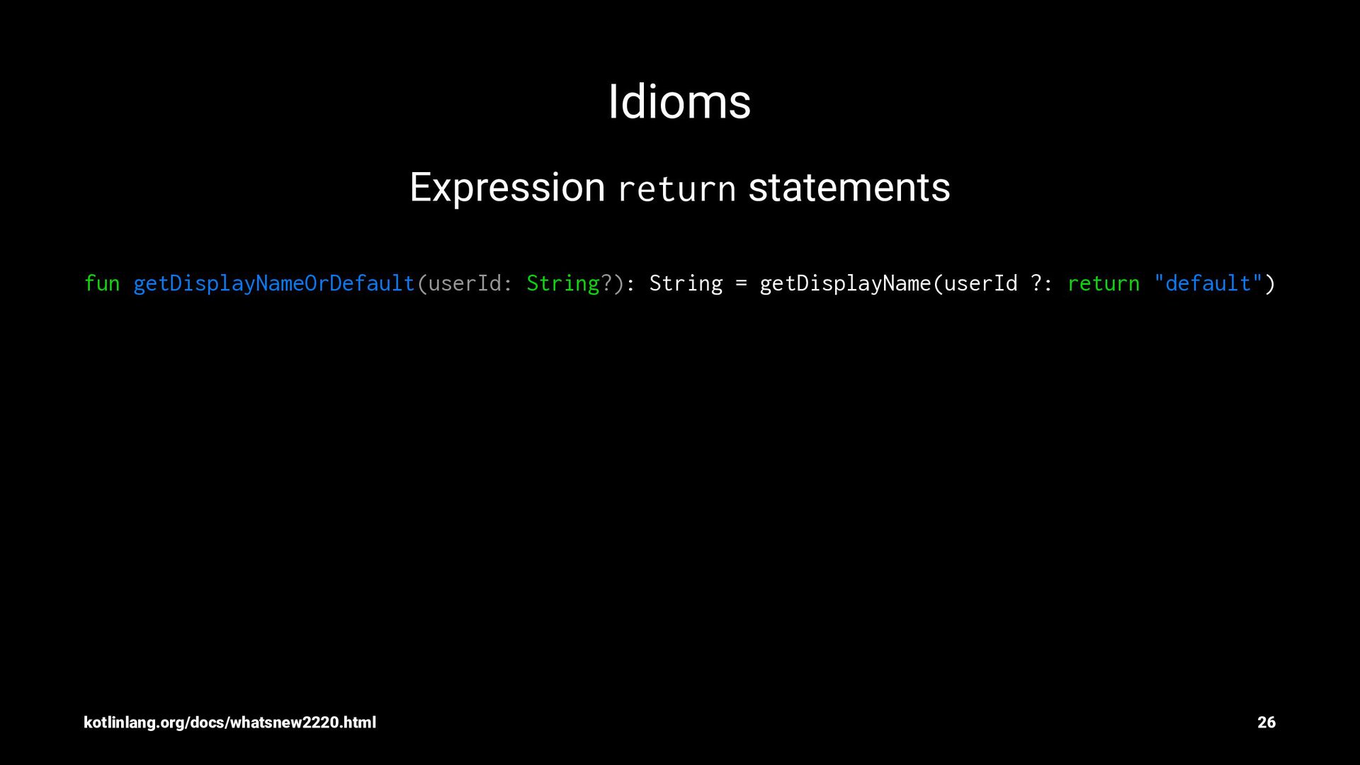5. Idioms Null Coalescing val fileSize = files?.size ?: run {