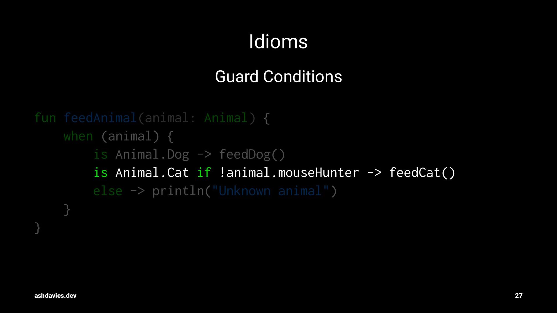 is Animal.Dog -> feedDog() is Animal.Cat if !animal.mouseHunter -> feedCat() else -> println("Unknown animal") } } ashdavies.dev 27