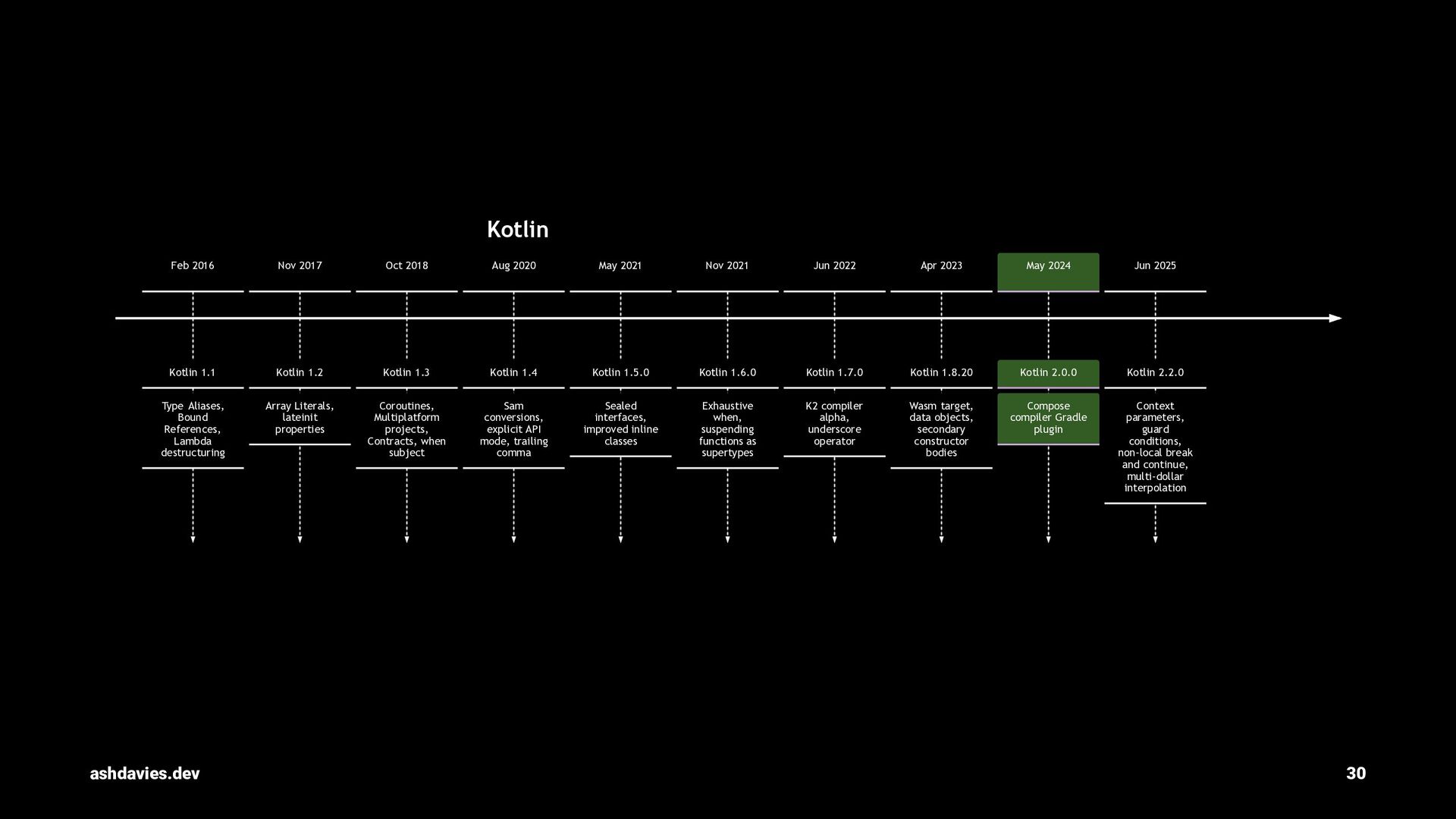 Nov 2017 Kotlin 1.2 Array Literals, lateinit properties Oct 2018 Kotlin 1.3 Coroutines, Multiplatform projects, Contracts, when subject Aug 2020 Kotlin 1.4 Sam conversions, explicit API mode, trailing comma May 2021 Kotlin 1.5.0 Sealed interfaces, improved inline classes Nov 2021 Kotlin 1.6.0 Exhaustive when, suspending functions as supertypes Jun 2022 Kotlin 1.7.0 K2 compiler alpha, underscore operator Apr 2023 Kotlin 1.8.20 Wasm target, data objects, secondary constructor bodies May 2024 Kotlin 2.0.0 Compose compiler Gradle plugin Jun 2025 Kotlin 2.2.0 Context parameters, guard conditions, non-local break and continue, multi-dollar interpolation Kotlin ashdavies.dev 30