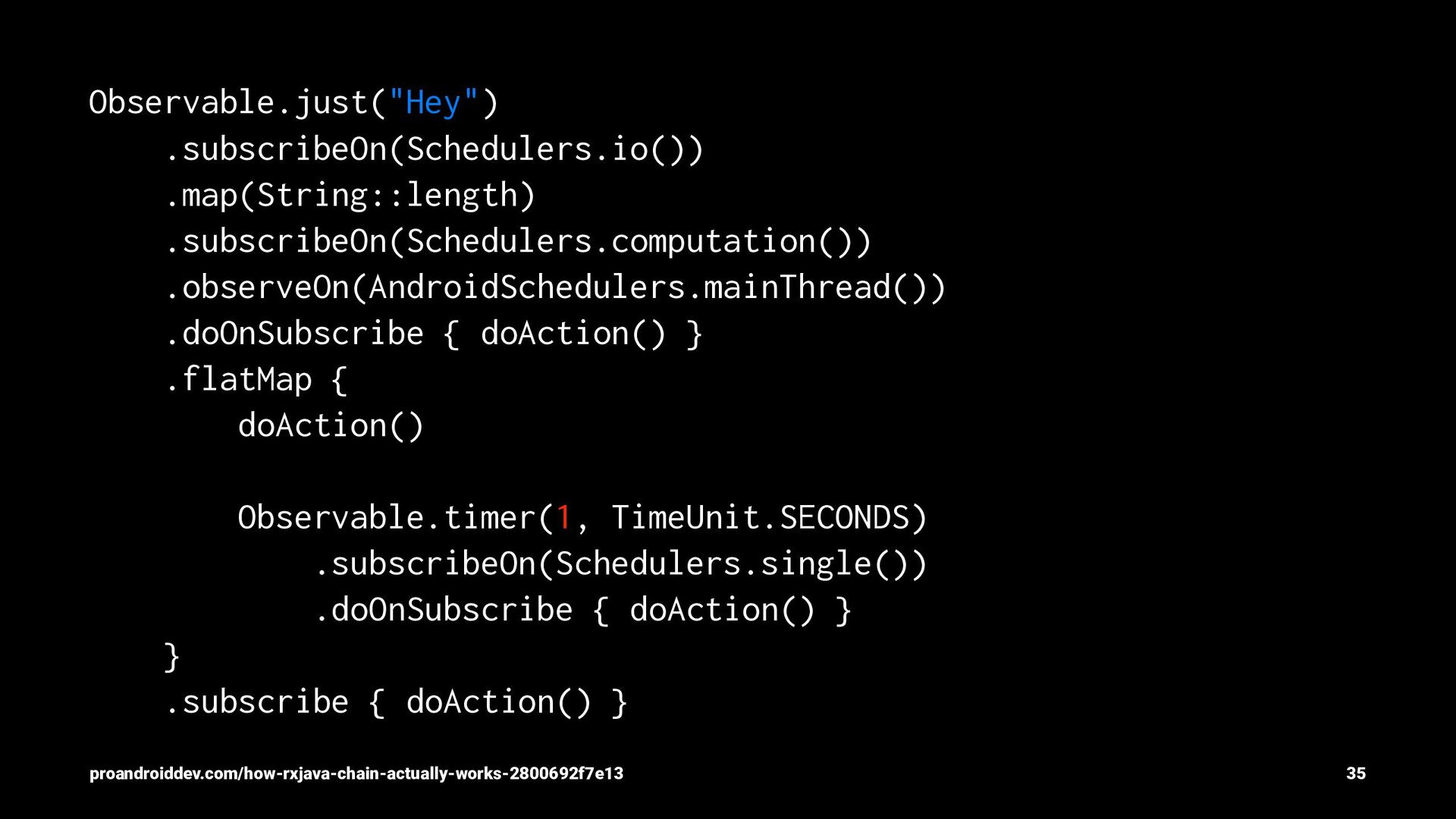 { doAction() Observable.timer(1, TimeUnit.SECONDS) .subscribeOn(Schedulers.single()) .doOnSubscribe { doAction() } } .subscribe { doAction() } proandroiddev.com/how-rxjava-chain-actually-works-2800692f7e13 35