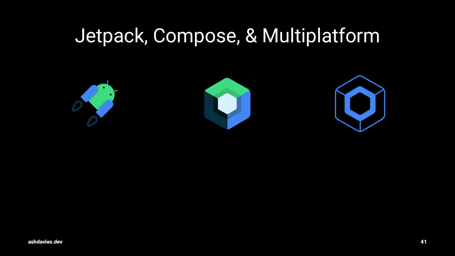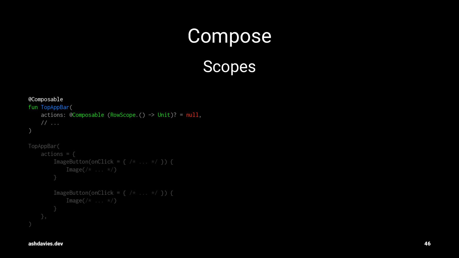 = null, // ... ) TopAppBar( actions = { ImageButton(onClick = { /* ... */ }) { Image(/* ... */) } ImageButton(onClick = { /* ... */ }) { Image(/* ... */) } }, ) ashdavies.dev 46