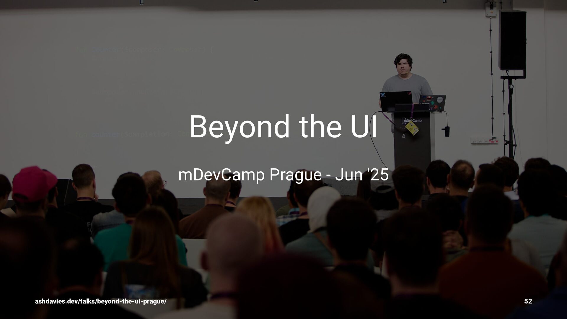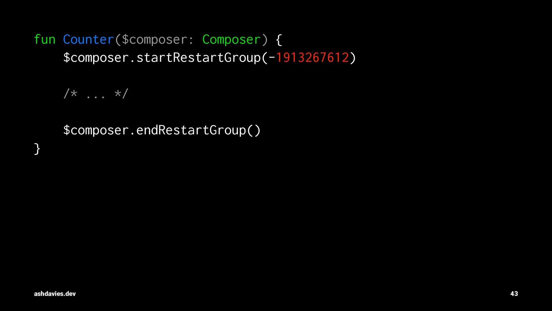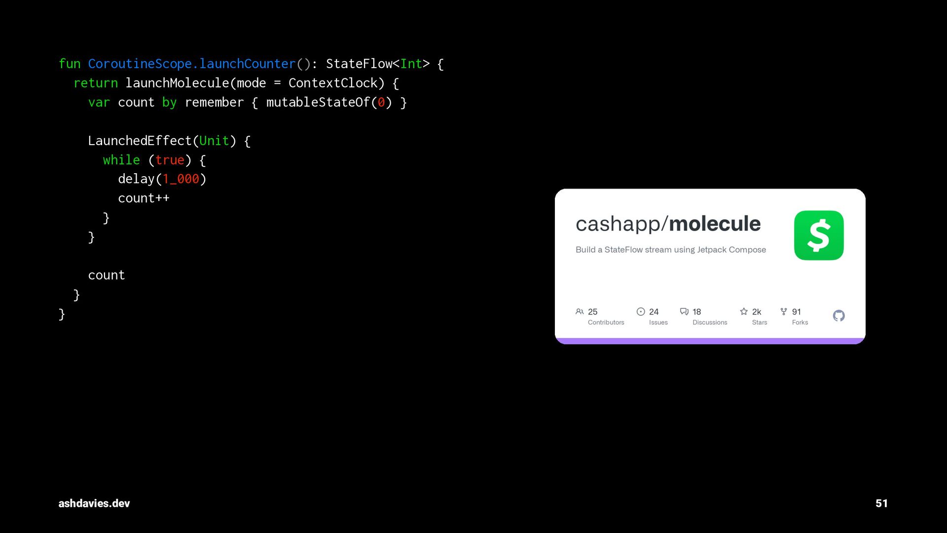 count by remember { mutableStateOf(0) } LaunchedEffect(Unit) { while (true) { delay(1_000) count++ } } count } } ashdavies.dev 51
