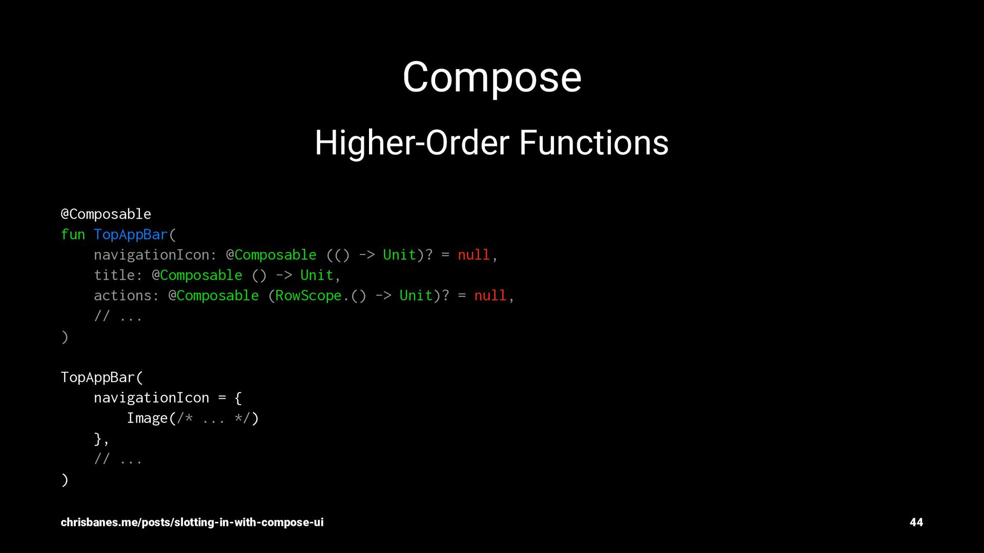 Unit)? = null, title: @Composable () -> Unit, actions: @Composable (RowScope.() -> Unit)? = null, // ... ) TopAppBar( navigationIcon = { Image(/* ... */) }, // ... ) chrisbanes.me/posts/slotting-in-with-compose-ui 44