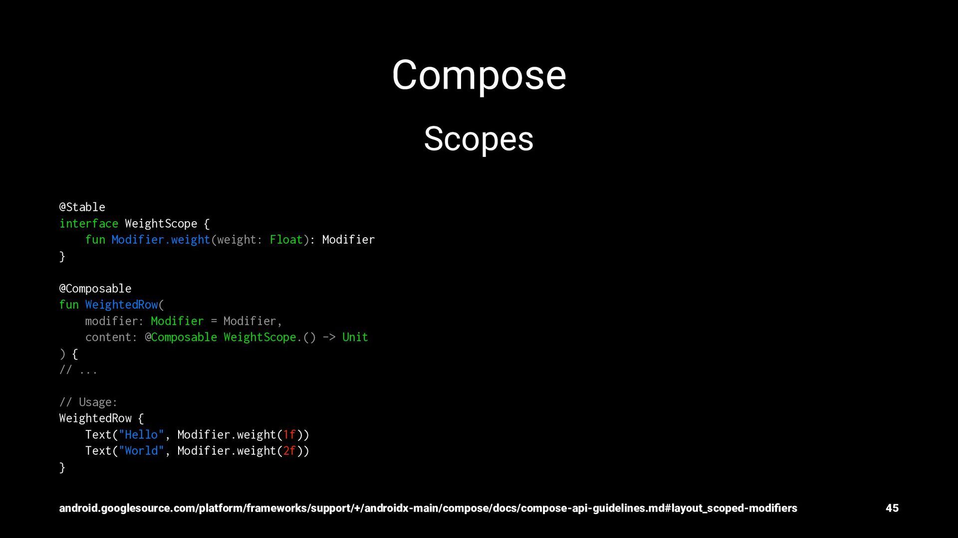 } @Composable fun WeightedRow( modifier: Modifier = Modifier, content: @Composable WeightScope.() -> Unit ) { // ... // Usage: WeightedRow { Text("Hello", Modifier.weight(1f)) Text("World", Modifier.weight(2f)) } android.googlesource.com/platform/frameworks/support/+/androidx-main/compose/docs/compose-api-guidelines.md#layout_scoped-modifiers 45