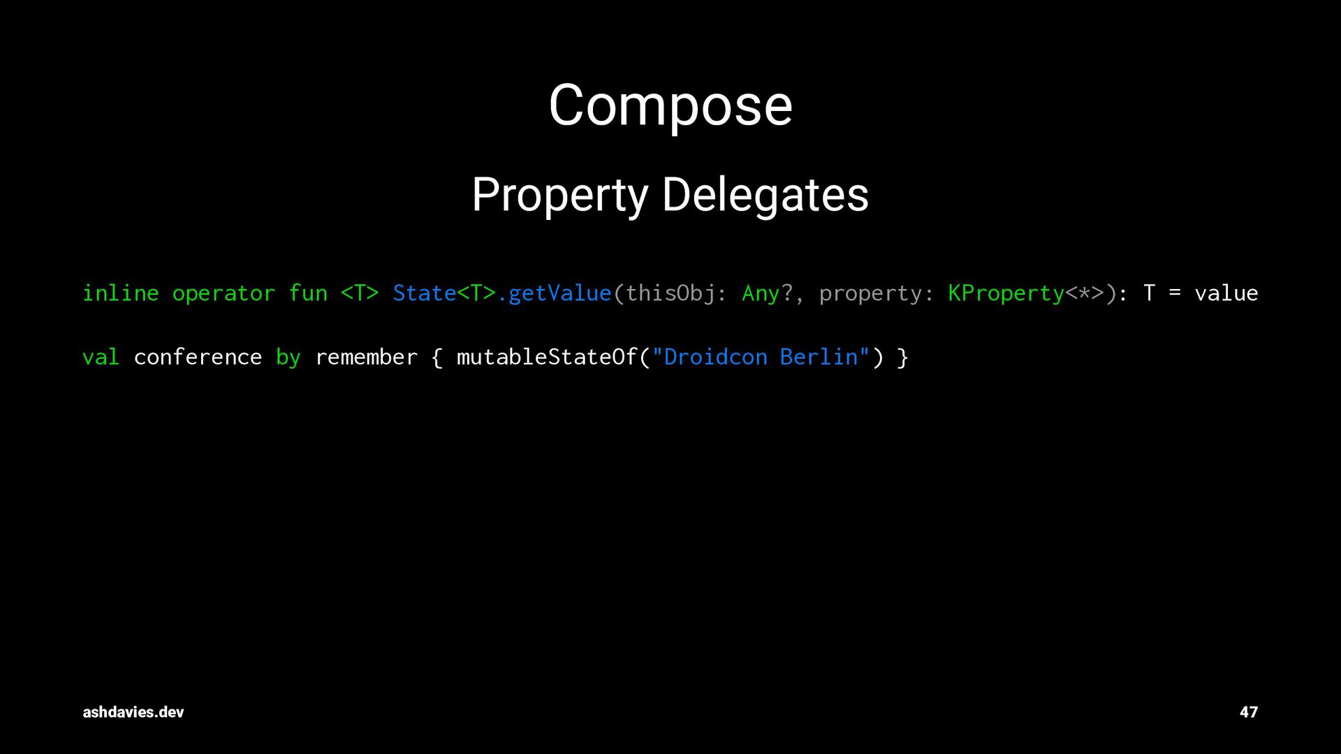 KProperty<*>): T = value val conference by remember { mutableStateOf("Droidcon Berlin") } ashdavies.dev 47