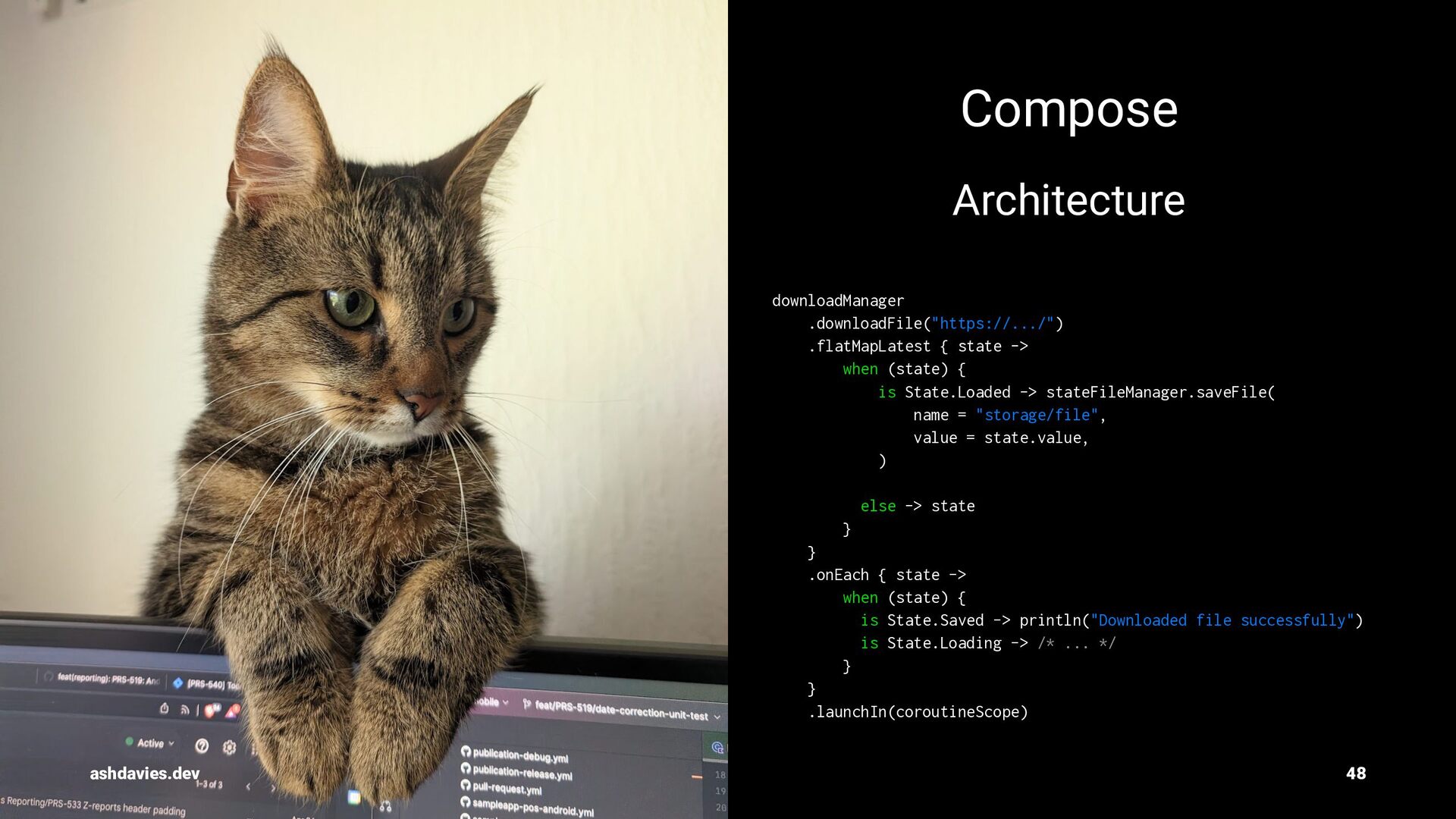 { is State.Loaded -> stateFileManager.saveFile( name = "storage/file", value = state.value, ) else -> state } } .onEach { state -> when (state) { is State.Saved -> println("Downloaded file successfully") is State.Loading -> /* ... */ } } .launchIn(coroutineScope) ashdavies.dev 48