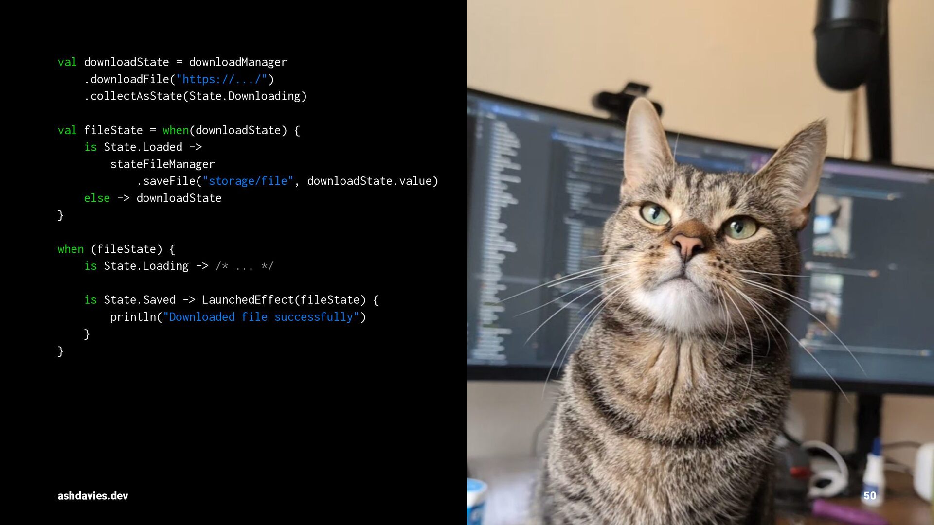 { is State.Loaded -> stateFileManager .saveFile("storage/file", downloadState.value) else -> downloadState } when (fileState) { is State.Loading -> /* ... */ is State.Saved -> LaunchedEffect(fileState) { println("Downloaded file successfully") } } ashdavies.dev 50