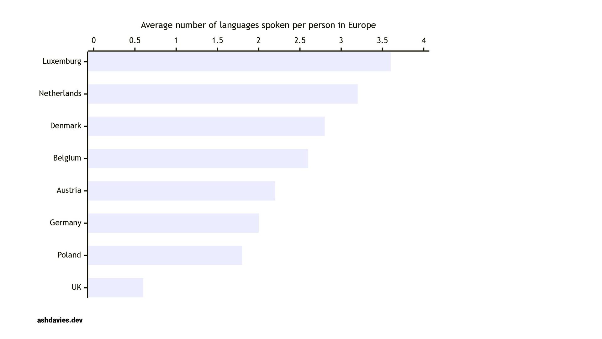 1 1.5 2 2.5 3 3.5 4 Average number of languages spoken per person in Europe ashdavies.dev 56